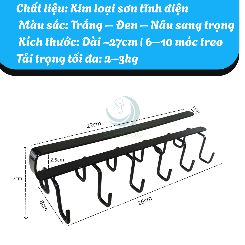 Mua tại TiktokMô tả chi tiết sản phẩm: Móc treo đa năng được thiết kế thông minh, gắn trực tiếp dưới mặt kệ bếp hoặc tủ gỗ, giúp tối ưu không gian lưu trữ và sắp xếp gọn gàng các dụng cụ nhà bếp như muỗng, vá, cọ rửa, khăn, ly tách... Sản phẩm có cấu tạo từ kim loại phủ sơn tĩnh điện, chắc chắn, bền bỉ và dễ lắp đặt mà không cần khoan vít. Ưu điểm nổi bật: