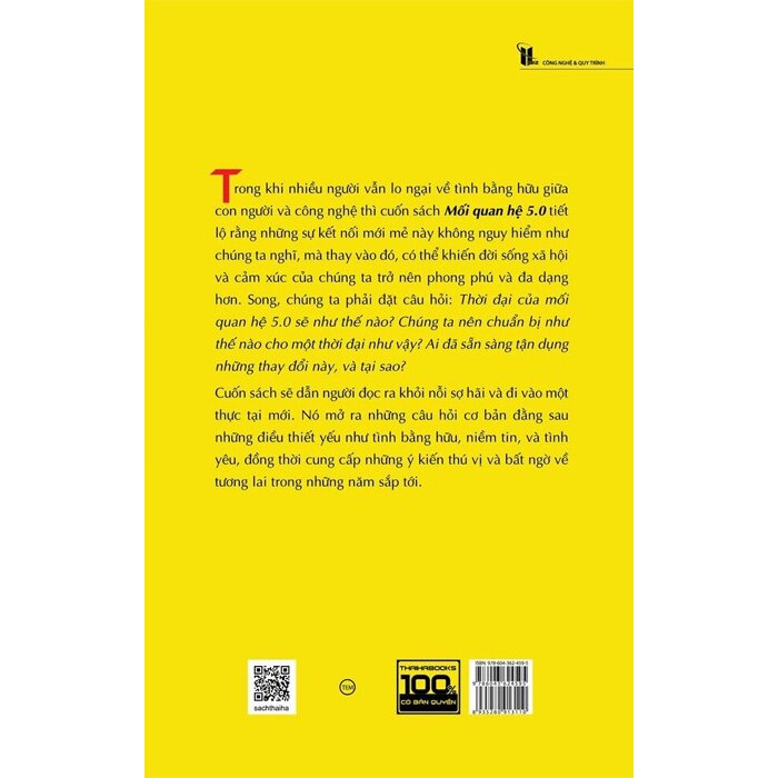 Giới thiệu sách Mối Quan Hệ 5. 0 Trong khi nhiều người vẫn lo ngại về tình bằng hữu giữa con người và công nghệ thì cuốn sách  tiết lộ rằng những sự kết nối mới mẻ này không nguy hiểm như chúng ta nghĩ, mà thay vào đó, có thể khiến đời sống xã hội và cảm xúc của chúng ta trở nên phong phú và đa dạng hơn. Song, chúng ta phải đặt câu hỏi: Thời đại của  như thế nào? Chúng ta nên chuẩn bị như thế nào cho một thời đại như vậy? Ai đã sẵn sàng tận dụng những thay đổi này, và tại sao? Cuốn sách sẽ dẫn người đọc ra khỏi nỗi sợ hãi và đi vào một thực tại mới. Nó mở ra những câu hỏi cơ bản đằng sau những điều thiết yếu như tình bằng hữu, niềm tin, và  tình yêu, đồng thời cung cấp những ý kiến thú vị và bất ngờ về tương lai trong những năm sắp tới. Mục lục sách Mối Quan Hệ 5. 0
