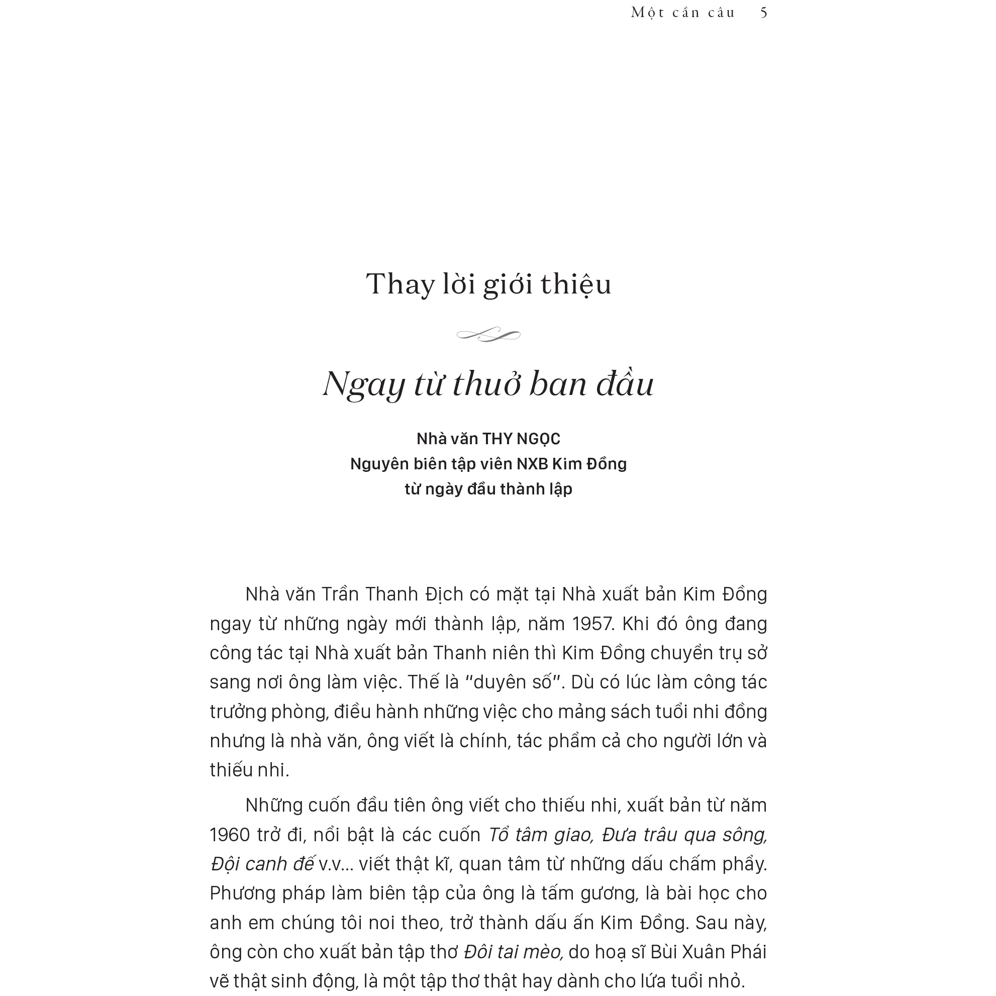 “Một cần câu” kể về chuyện câu cá nhưng ở đó thể hiện những cảm xúc tuổi thơ nhân văn, hồn hậu, những bài học làm người giản dị mà thấm thí Trong tập sách, người đọc còn lay động với hồi ức “Con nhà quan” để hiểu thêm về nỗi khát khao học hỏ
