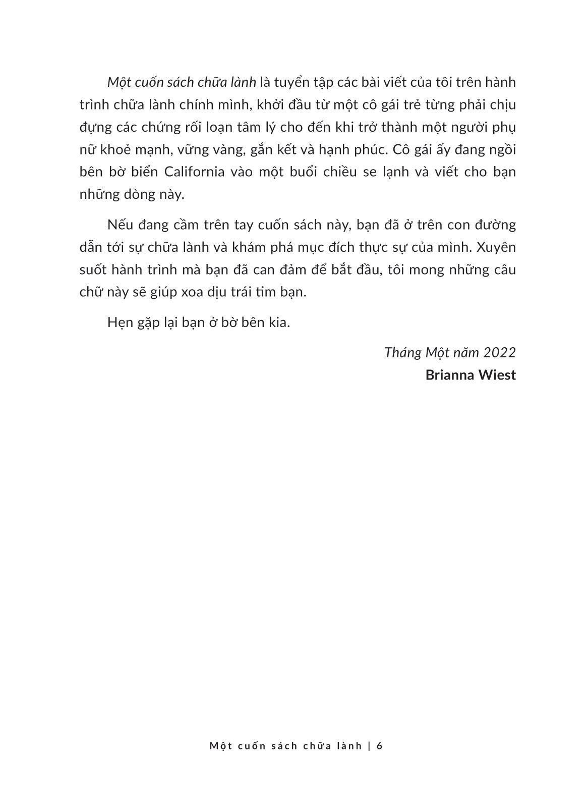 Brianna Wiest là tác giả của nhiều tựa sách chữa lành bán chạy, được dịch ra hơn 20 thứ tiếng. Cô cũng là ngòi bút xuất sắc của Forbes, Thought Catalog. Những cuốn sách của cô diễn tả sự chữa lành theo hướng nhẹ nhàng và đi vào lòng người, bởi Brianna hiểu được rằng thay đổi khởi nguồn từ chính mỗi người, và mỗi cuốn sách của cô là một món quà quý giá cho cộng đồng.