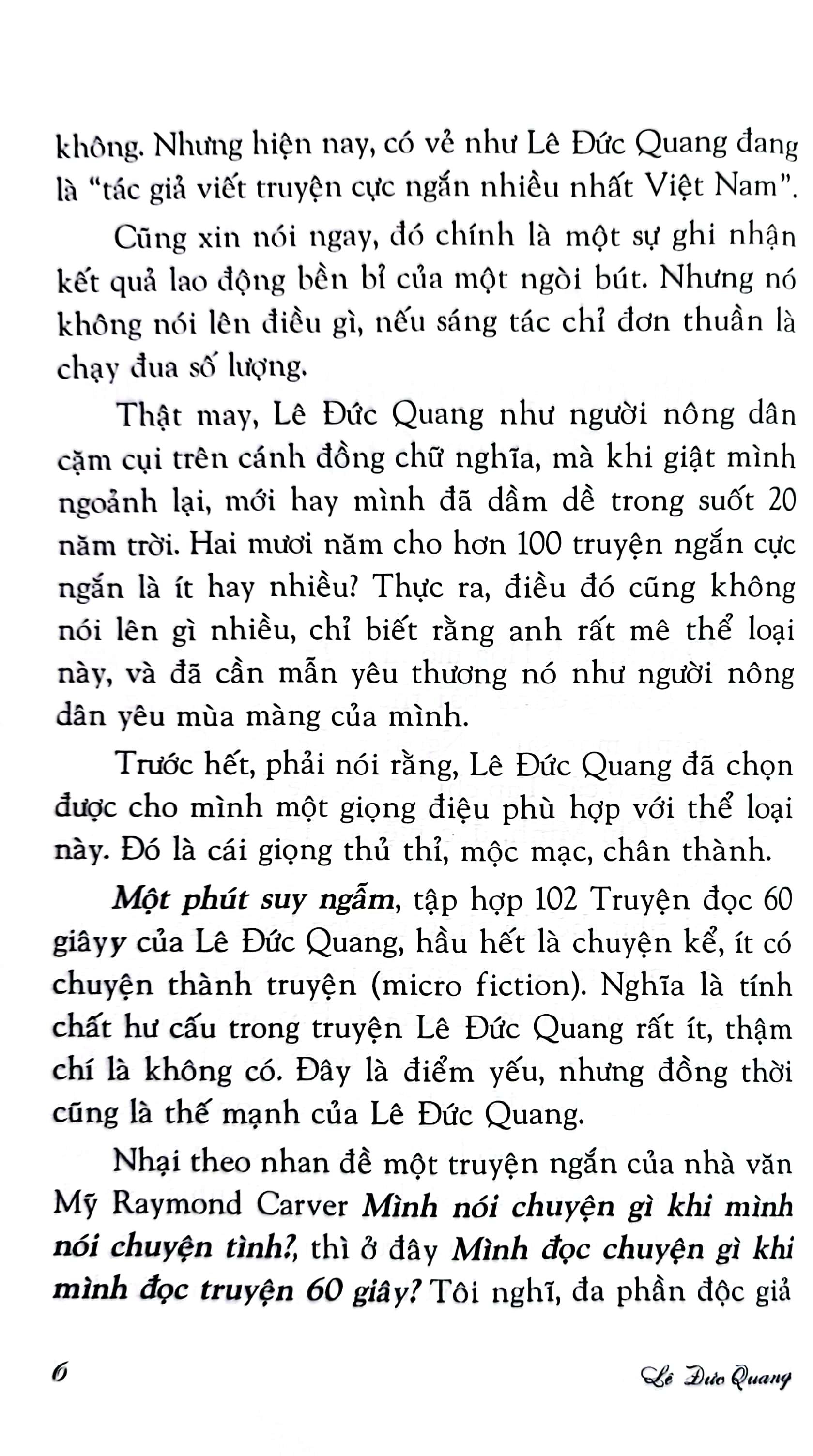 Thật may, Lê Đức Quang như người nông dân cặm cụi trên cánh đồng chữ nghĩa, mà khi giật mình ngoảnh lại, mới hay mình đã dầm dề trong suốt 20 năm trời. Hai mươi năm cho hơn 100 truyện ngắn cực ngắn là ít hay nhiều? Thực ra, điều đó cũng không nói lên gì nhiều, chỉ biết rằng anh rất mê thể loại này, và đã cần mẫn yêu thương nó như người nông dân yêu mùa màng của mình.”