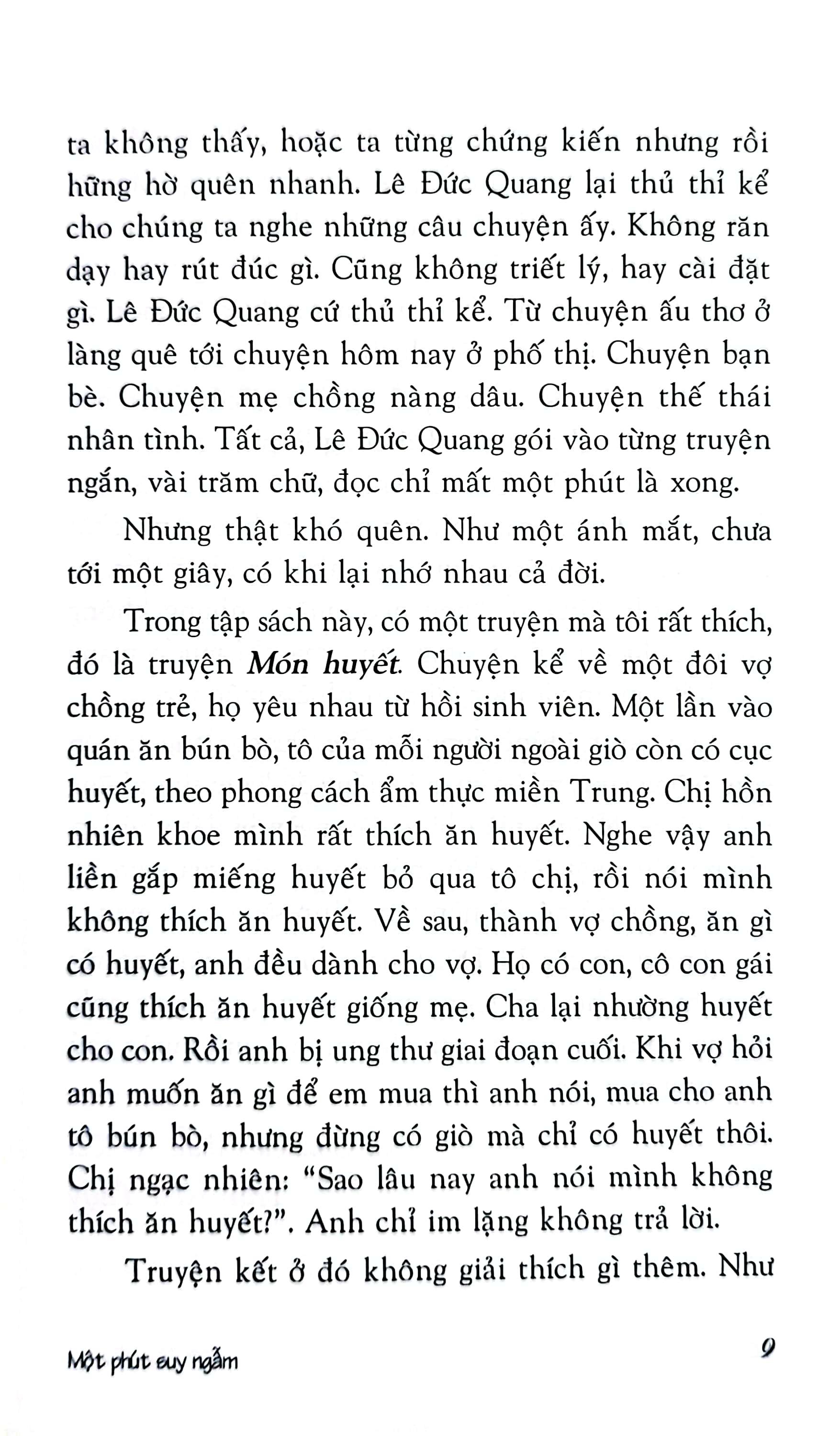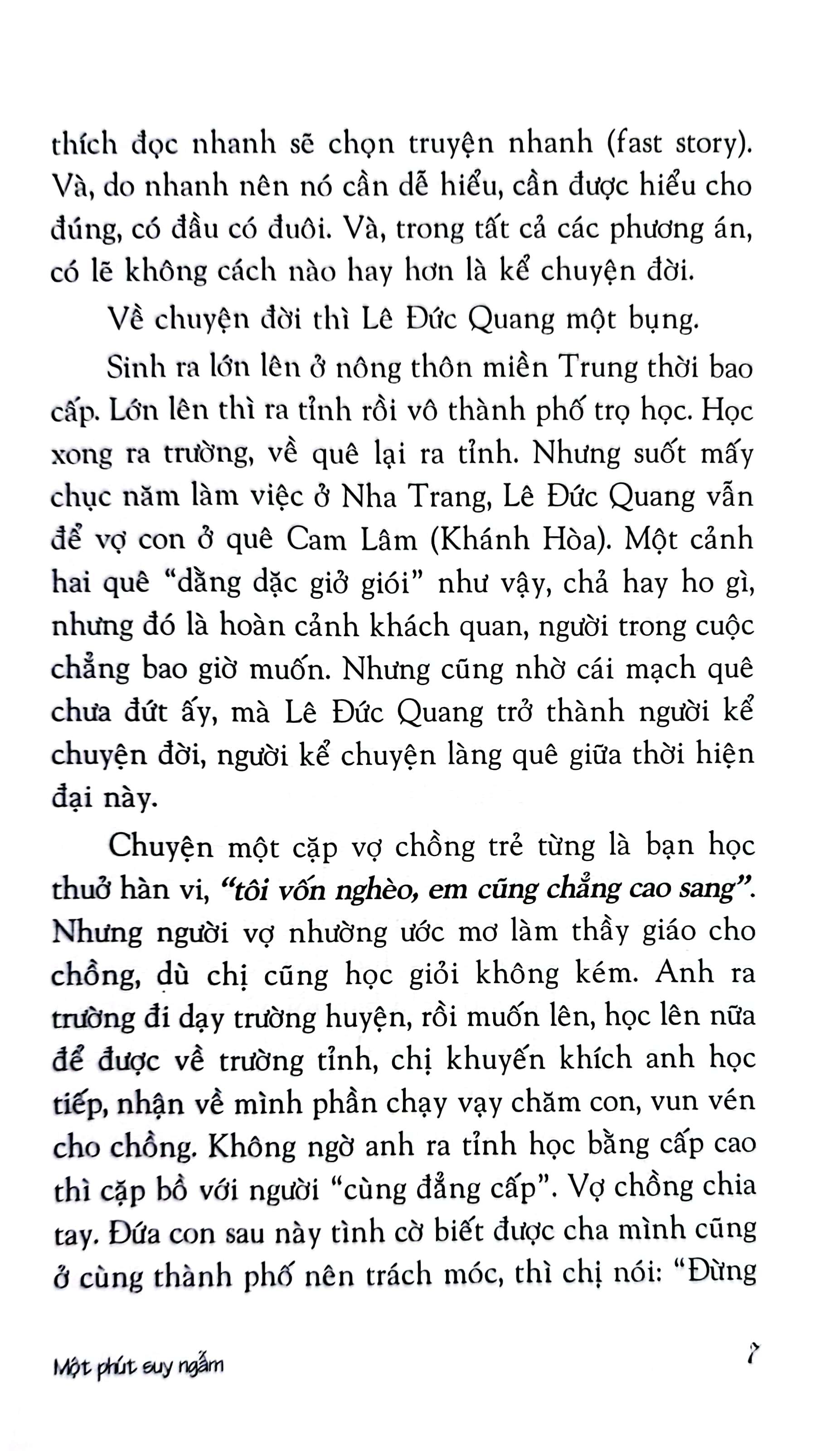 Đó là những chuyện như xảy ra hằng ngày, mà ta không thấy, hoặc ta từng chứng kiến nhưng rồi hững hờ quên nhanh. Lê Đức Quang lại thủ thỉ kể cho chúng ta nghe những câu chuyện ấy. Không răn dạy hay rút đúc gì. Cũng không triết lý, hay cài đặt gì. Lê Đức Quang cứ thủ thỉ kể. Từ chuyện ấu thơ ở làng quê tới chuyện hôm nay ở phố thị. Chuyện bạn bè. Chuyện mẹ chồng nàng dâu. Chuyện thế thái nhân tình. Tất cả, Lê Đức Quang gói vào từng truyện ngắn, vài trăm chữ, đọc chỉ mất 1 phút là xong.