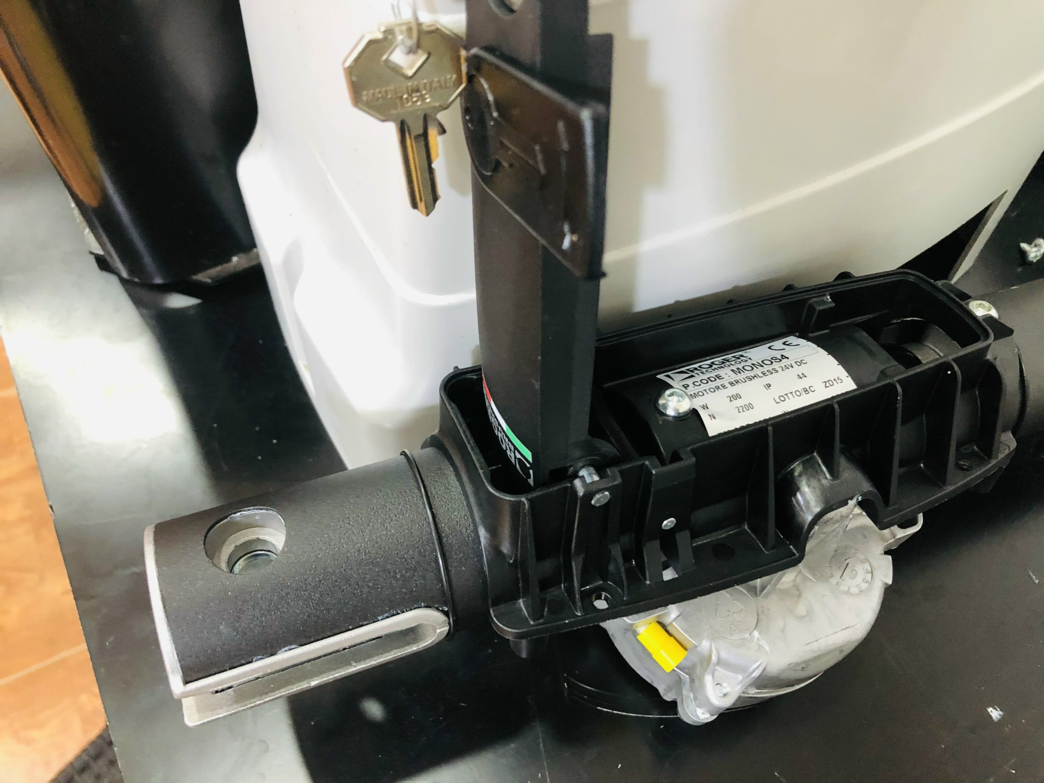 1 - Khóa mô tơ: Hay còn được gọi là khóa chốt, khóa chì Có thể bật nắp lên và tra chìa vào ổ, sau đó có thể mở cổng bằng tay như cổng thường. Chìa khóa thường phải dùng theo chìa khóa của bộ sản phẩm theo hãng. Ở Việt Nam rất khó đánh lại chìa khóa do không có phôi chìa.