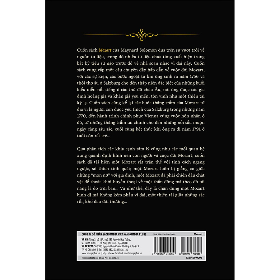 Mozart là một công trình nổi bật của nhà âm nhạc học Maynard Solomon, với giọng kể khách quan và dựa trên sự vượt trội về nguồn tư liệu, trong đó có nhiều tư liệu chưa từng xuất hiện trong bất kỳ tiểu sử nào trước đó về nhà soạn nhạc vĩ đại này. Cuốn sách đã giúp chúng ta được nhìn thấy người nhạc sĩ vĩ đại ở một góc nhìn khác biệt. Người đọc sẽ không còn thấy một Mozart thần thánh nữa, mà là một Mozart đời thường, một nhạc sĩ cũng phải kinh qua những bế tắc trong cuộc sống. Cuốn sách nói về các sự kiện, những bước ngoặt từ khi ông sinh ra vào năm 1756 và thời thơ ấu ở Salzburg cho đến thập niên đặc biệt của những buổi biểu diễn nổi tiếng ở các thủ đô châu Âu, nơi ông được các gia đình hoàng gia và khán giả yêu mến, tôn vinh như một thiên tài kỳ lạ. Cuốn sách cũng kể lại các bước thăng trầm của Mozart từ địa vị là người con được yêu thích của Salzburg trong những năm 1770, đến hành trình chinh phục Vienna cùng cuộc hôn nhân ở đó, từ những thăng trầm tài chính cho đến những nỗi sầu muộn ngày càng sâu sắc, cuối cùng kết thúc với sự ra đi ở tuổi còn rất trẻ của ông năm 1791… Qua phân tích các khía cạnh tâm lý cũng như các mối quan hệ xung quanh đã định hình nên con người và cuộc đời Mozart, cuốn sách đã tái hiện một Mozart rất trần thế với tính cách ngang ngược, sở thích tinh quái; một Mozart luôn bị giằng co giữa những “món nợ” với gia đình, một Mozart đã phải chiến đấu chật vật để thoát khỏi huyền thoại về một thần đồng mà theo đó tài năng là do trời ban… Và như thế, đây là chân dung một Mozart bình dị mà không kém phần vĩ đại, một thiên tài giữa những rắc rối, khổ đau… Đánh giá/ nhận xét của chuyên gia: “Maynard Solomon viết với sự duyên dáng của một tiểu thuyết gia, cái nhìn sâu sắc của một triết gia và sự chính xác của một thám tử. Chúng ta biết đến Mozart với tư cách là một thiên tài âm nhạc, nhưng hơn thế nữa, ông là một con người, biết thở và biết suy nghĩ”.