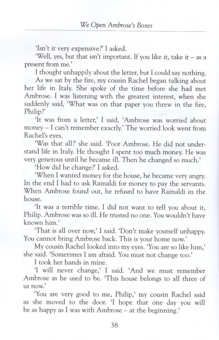 "From the first pagethe reader is back in the moody, brooding atmosphere of Rebecca." The New York Times "From the bestselling author of Rebecca, another classic set in beautiful and mysterious Cornwall." Philip Ashley's older cousin Ambrose, who raised the orphaned Philip as his own son, has died in Rome. Philip, the heir to Ambrose's beautiful English estate, is crushed that the man he loved died far from home. He is also suspicious. While in Italy, Ambrose fell in love with Rachel, a beautiful English and Italian woman. But the final, brief letters Ambrose wrote hint that his love had turned to paranoia and fear.