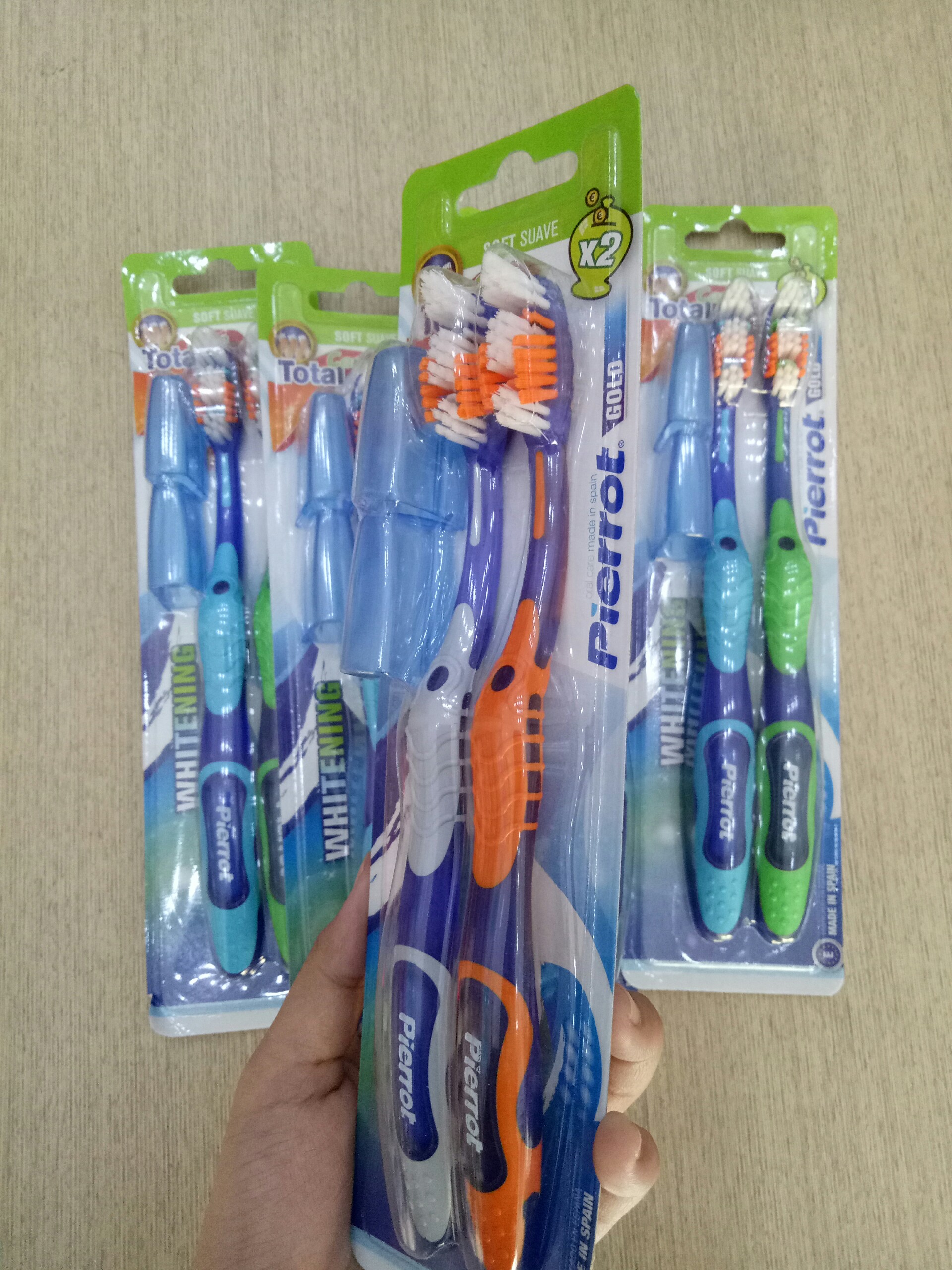 Bộ 2 bàn chải đánh răng Pierrot vàng siêu mềm với đầu lông chải xiên linh hoạt có khả năng làm sạch sâu tận kẽ chân răng. Bàn chải có kèm dụng cụ làm sạch lưỡi ở phần thân giúp vệ sinh răng miệng sạch sẽ. Mỗi bàn chải đánh răng có một nắp đậy giúp bảo quản đầu bàn chải một cách hiệu quả tránh bụi bẩn, vi khuẩn bám vào lông bàn chải. Bàn chải với lông mềm mại, vô cùng dễ chịu khi sử dụng, giúp răng nướu không bị tổn thương khi chải răng HDSD: dùng để đánh răng 2-3 lần/ ngày. Quy cách đóng gói: 1 bộ gồm 2 bàn chải Xuất xứ: Pierrot-Thổ Nhĩ Kỳ Hạn dùng: 8 năm kể từ ngày sản xuất, ngày sản xuất in trên sản phẩm Bảo quản: nơi thoáng mát #pierrot,#banchaidanhrang,#banchaipierrot