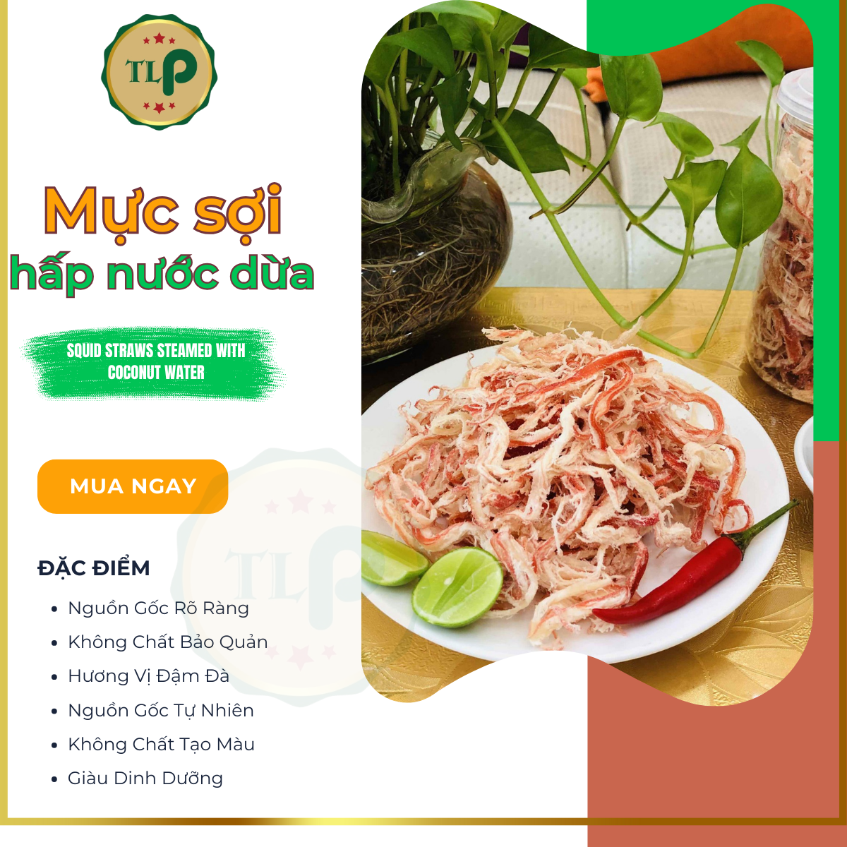 Thành phần: 85% Mực khô xé sợi, 3% lá chanh, 12% gia vị (đường, muối, ớt, bột ngọt, hành phi, tỏi, lá dứa, nước cốt dừa) Hạn sử dụng: 12 tháng kể từ ngày sản