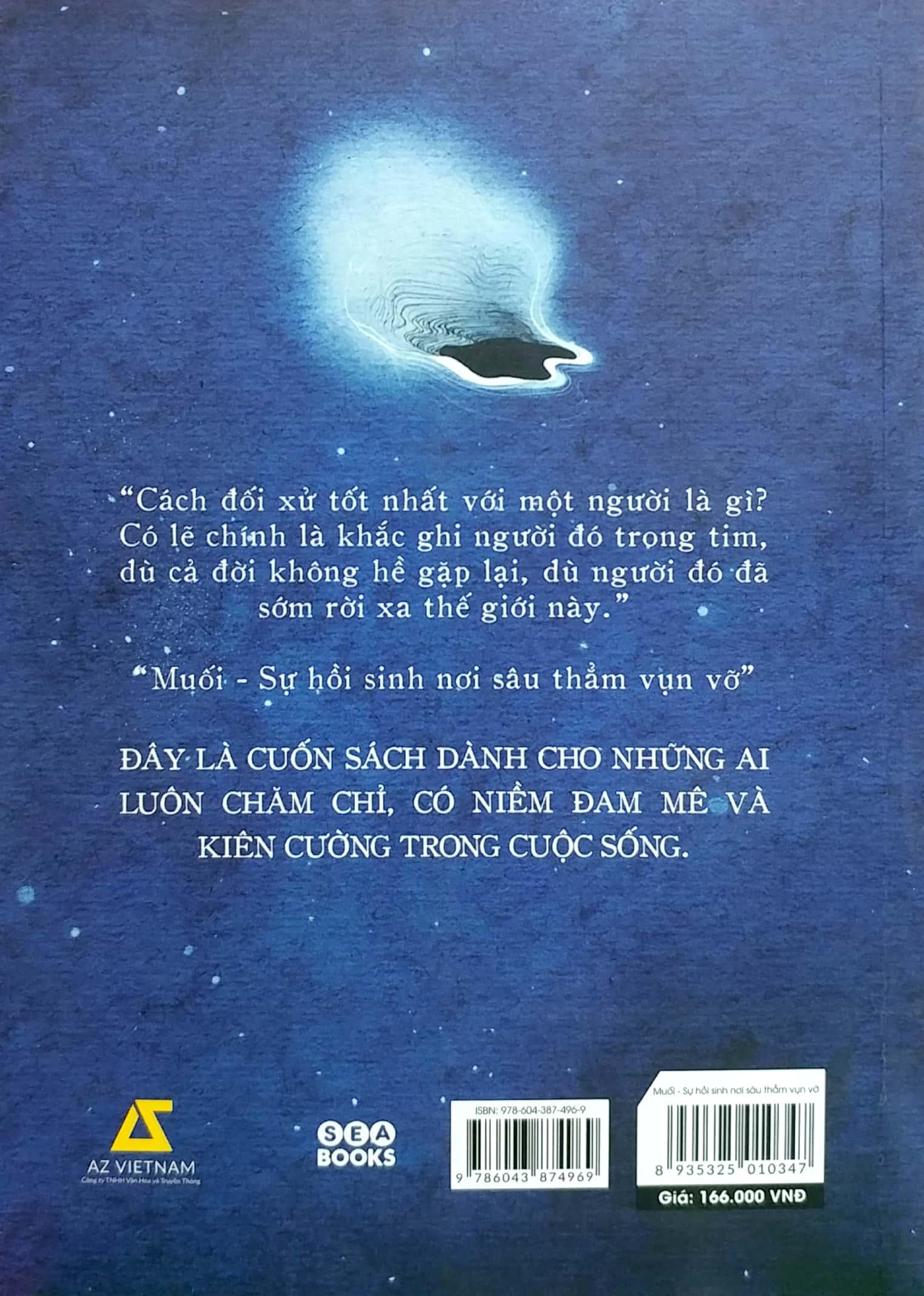 Muối - Sự Hồi Sinh Nơi Sâu Thẳm Vụn Vỡ “Cách đối xử tốt nhất với một người là gì? Có lẽ chính là khắc ghi người đó trong tim, dù cả đời không hề gặp lại, dù người đó đã sớm rời xa thế giới này” Trích “Muối - Sự hồi sinh nơi sâu thẳm vụn vỡ Tất thảy con người ta đều là những hạt muối nhỏ xíu ở trên đời. Nếu nó mất đi hương vị làm sao bắt nó mặn trở lại được nữa. Cũng như nếu một người muốn rời đi thì liệu chúng ta có thể bắt họ ở lại được không? Ý nghĩa thực sự của “Muối” chính là chúng ta chỉ đơn giản là một loại gia vị của cuộc sống. Chúng ta đều sẽ phải trải qua những hỷ, nộ, ái, ố - chia ly, tái hợp hay giữa sự sống và cái chết. Những nỗi đau xé lòng, những sự tiếc nuối trong vài đoạn tình cảm khi mà mọi sự xảy ra đều không phải ngẫu nhiên. “MUỐI - Sự hồi sinh nơi sâu thẳm vụn vỡ” là cuốn sách tổng hợp của sự hợp tan vui buồn trên cõi đời này. Chúng ta là những con người đang sống - là những hạt muối nhỏ trên thế gian và đó chính là bản chất của cuộc đời. Nhưng sau cùng thì ở cõi nhân gian này được làm một hạt muối mạnh khỏe, bình an và hạnh phúc cũng là điều tốt nhất rồi.