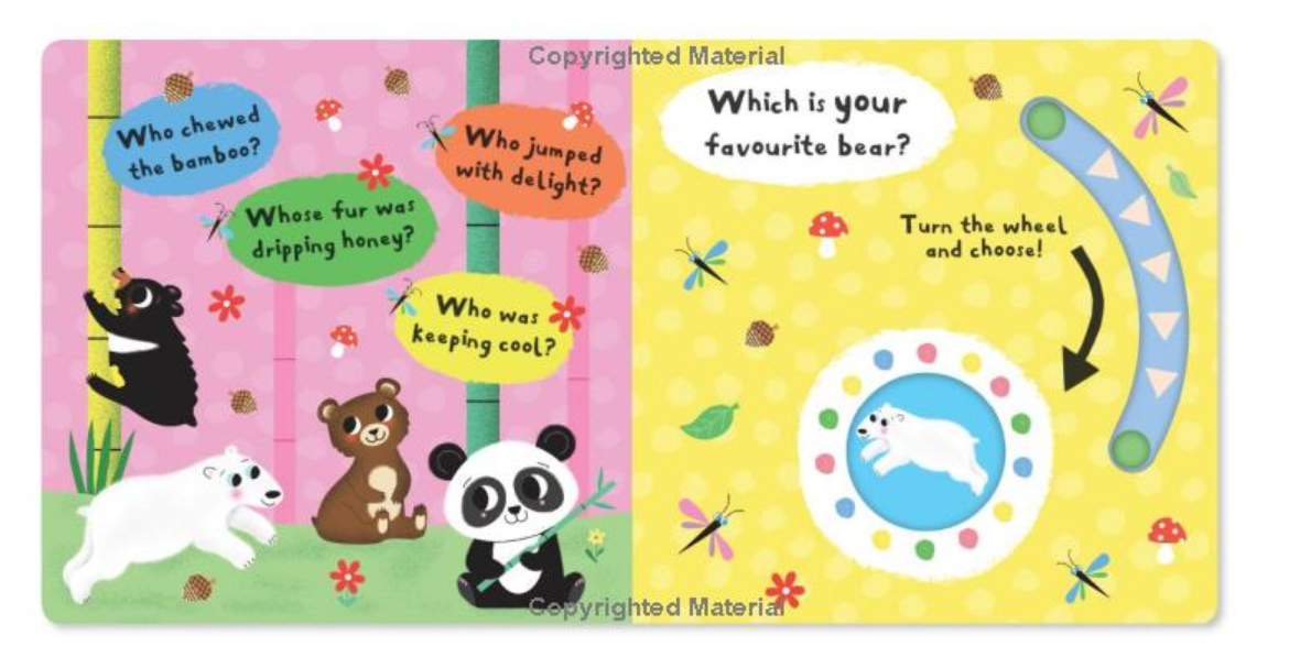 In My Favourite Bear, older babies and toddlers can have lots of fun lifting the peekaboo flaps to discover what each bear is doing. There is a rhyme to share, recap questions and a wheel to turn at the end to choose your favourite bear from inside the book. From the adorable panda chomping on bamboo to the messy bear who loves to eat honey, which bear will your little one pick?
