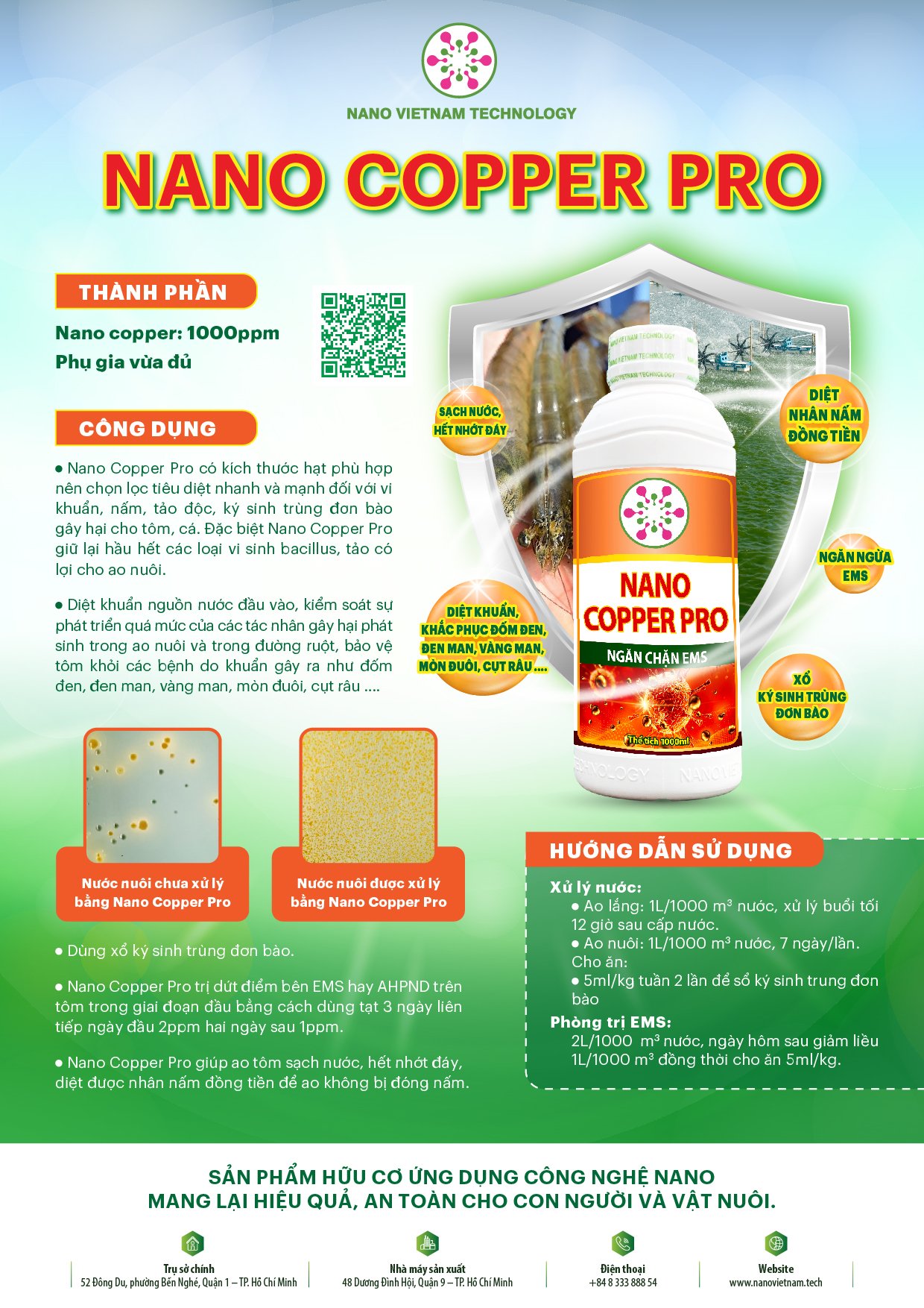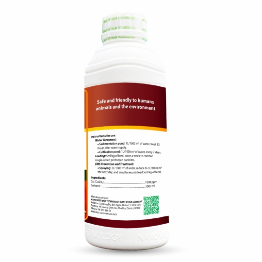 - Giúp nước ao tôm sạch, hết nhớt đáy, diệt nhân nấm đồng trong ao nuôi. Thành phần: Nano Copper Pro: ... 1000 ppm Phụ gia vừa đủ: ...500 ml Hướng dẫn xử dụng: +Xử lý nước: Ao lắng: 1L/1000 m3 nước, xử lý buổi tối 12 giờ sau cấp nước. Ao nuôi: 1L/1000 m3 nước, 7 ngày/lần. +Cho ăn: 5ml/kg thức ăn, 2 lần/tuần để sổ ký sinh trùng đơn bào. +Phòng trị EMS: Tạt: 2L/1000 m3 nước, ngày hôm sau giảm liều tạt 1L/1000 m3 đồng thời cho ăn 5ml/kg thức ăn. Bảo quản