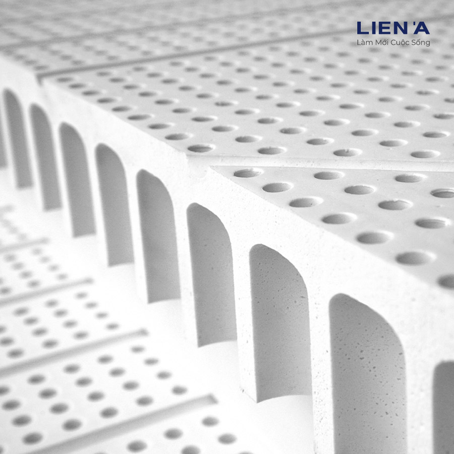 Liên Á tiên phong ứng dụng thành công cấu trúc vòm vào dòng nệm cao su thiên nhiên thế hệ mới. Nệm được thiết kế với hàng ngàn lỗ thông hơi tròn có mái vòm có tác dụng thúc tản nhiệt, đưa không khí thoát hơi nhanh hơn. Kết cấu vòm giúp tăng cường độ bật nảy cho nệm, nâng đỡ tối ưu trọng lượng cơ thể, giữ cho cơ thể luôn ở trạng thái thoải mái, thư giãn, nệm cũng chắc chắn và bền bỉ hơn trong việc hạn chế xẹp lún, mất dáng sau thời gian sử dụng.