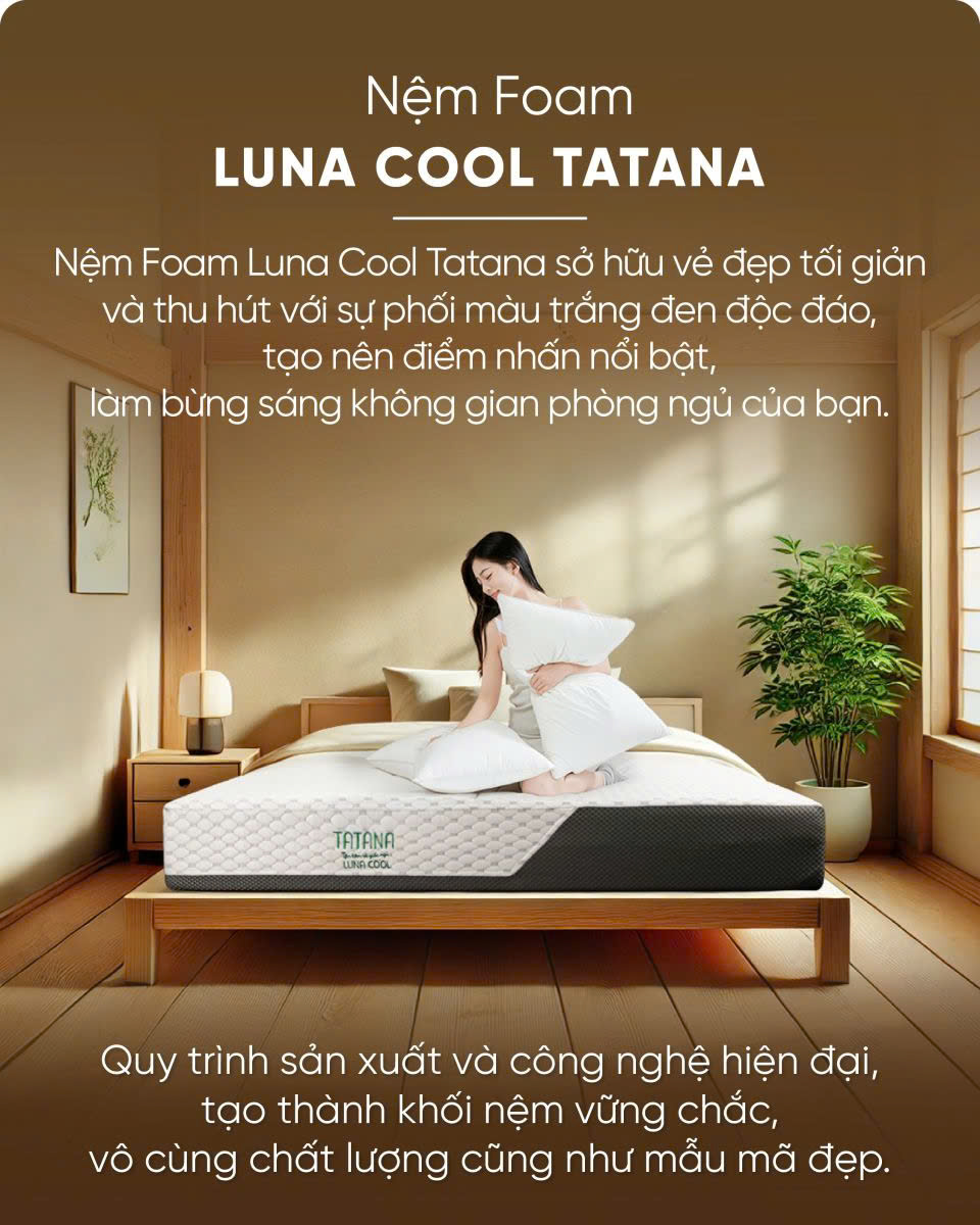 Nệm Luna Cool Tatana là dòng nệm có độ đàn hồi cao, giúp nâng đỡ trọn vẹn các đường cong cơ thể. Nệm Luna Cool được trang bị thêm lớp Gel Memory Foam xanh giúp nệm trở nên mát mẻ vào mùa hè và ấm áp vào mùa đông. Ngoài ra, nệm còn sở hữu nhiều ưu điểm khác nhau mang đến cho người dùng cảm giác thoải mái tối ưu khi nằm.