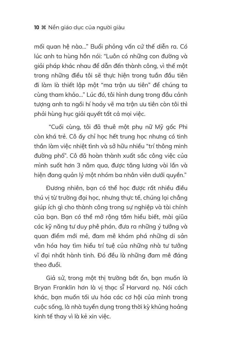 Bạn sẽ thấy được điều đó khi đọc Nền giáo dục của người giàu của Michael Ellsberg. Tác giả đã phỏng vấn các tỉ phú và triệu phú không có bằng đại học, bao gồm ông trùm thời trang Russell Simmons, chủ tịch đồng sáng lập ok Sean P Bên cạnh đó, Michael Ellsberg còn đưa ra những chỉ dẫn tuyệt vời để bạn tiến tới thành công bằng những kỹ năng vô cùng đơn giản: Để tìm được người hướng dẫn, cách tạo hứng thú trong công việc, cách xây dựng phong cách cá nhân và nhiều hơn thế nữa.