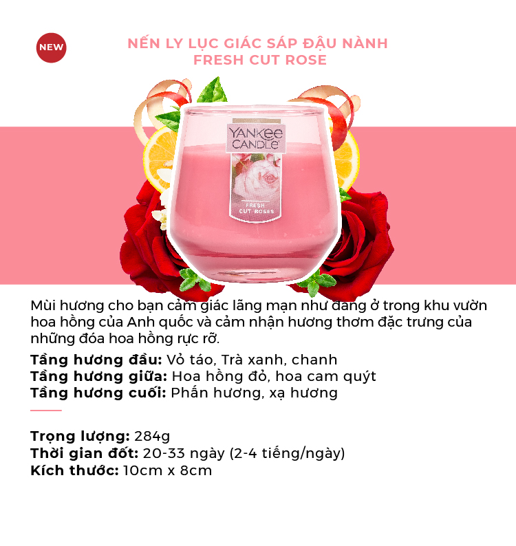✨Nến Ly Lục Giác Sáp Đậu Nành 284gram từ Yankee Candle - Fresh Cut Roses