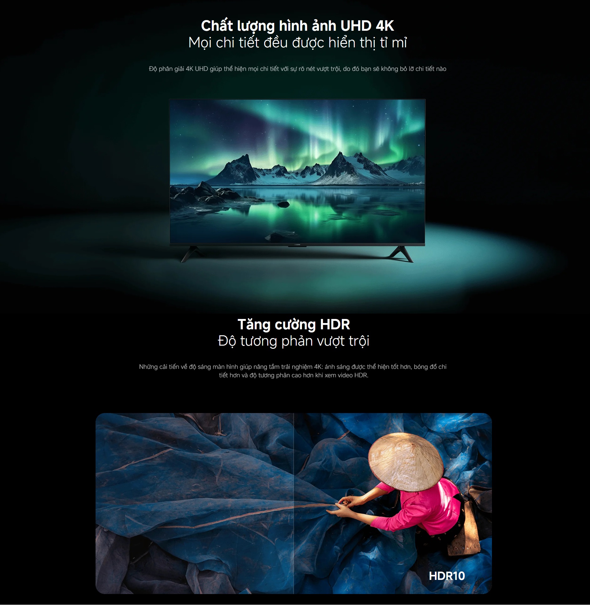 Đặc điểm nổi bật Tivi 43 inch thiết kế nhỏ gọn, viền mỏng kết hợp màn hình độ phân giải 4K. HDR10 tăng cường khả năng thể hiện chi tiết trong cả vùng sáng và