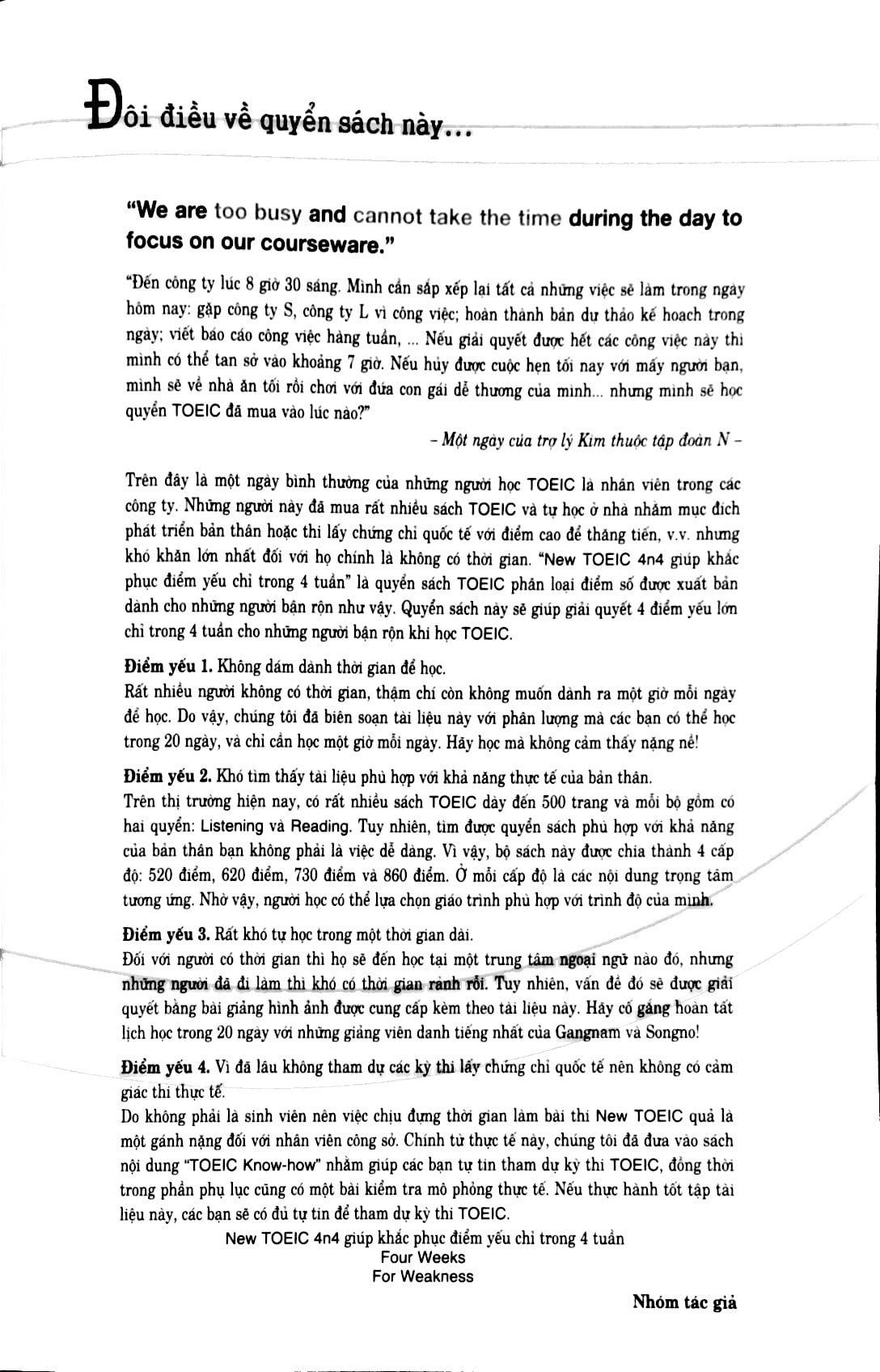 Trên đây là một ngày bình thường của những người học TOEIC là nhân viên trong các công ty. Những người này đã mua rất nhiều sách TOEIC và tự học ở nhà nhằm mục đích phát triển bản thân hoặc thi lấy chứng chỉ quốc tế với điểm cao để thăng tiến, nhưng khó khăn lớn nhất đối với họ chính là không có thời gian. “New TOEIC 4n4 giúp khắc phục điểm yếu chỉ trong 4 tuần” là quyển sách TOEIC phân loại điểm số được xuất bản dành cho những người bận rộn như vậy. Quyển sách này sẽ giúp giải quyết 4 điểm yếu lớn chỉ trong 4 tuần cho những người bận rộn khi học TOEIC.