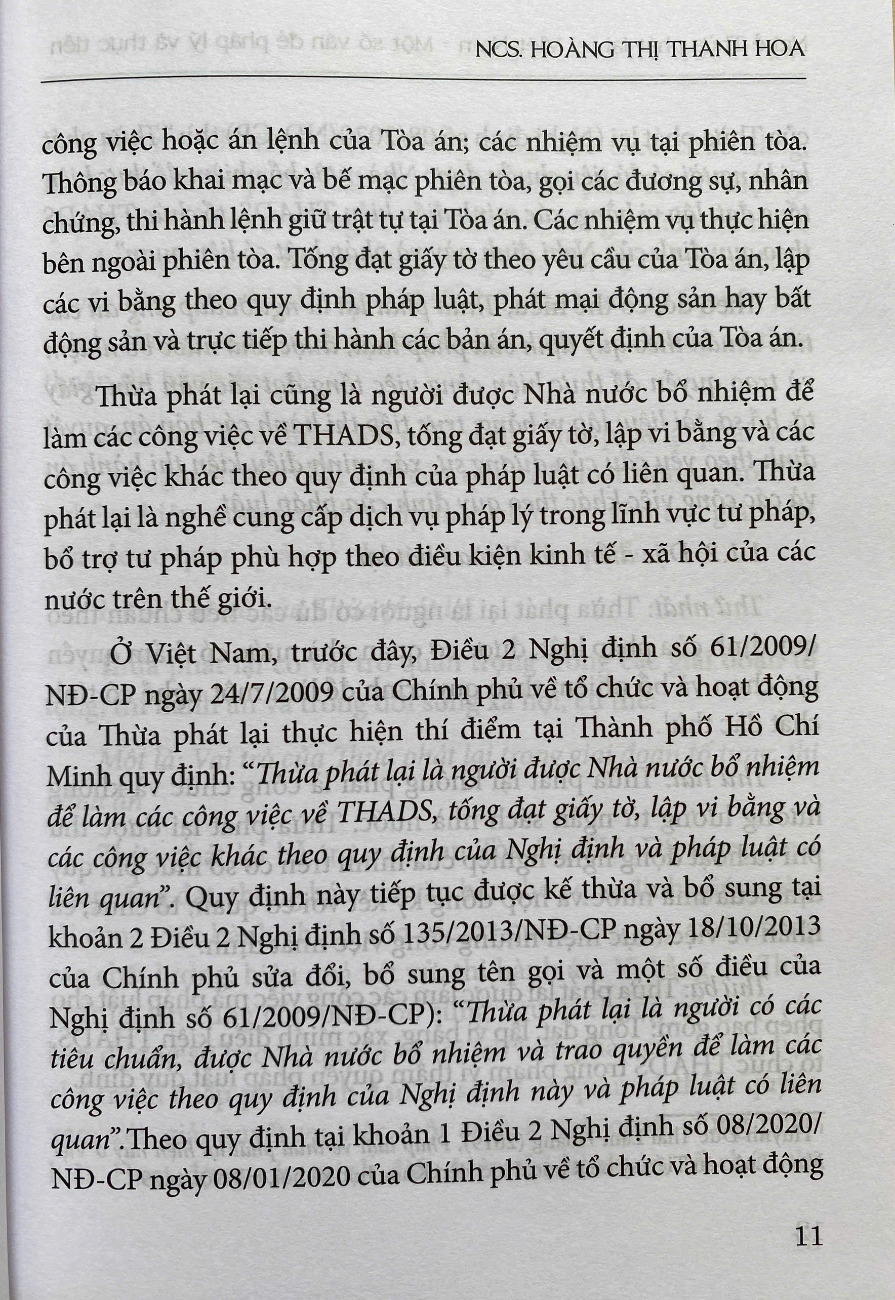 Cuốn sách "Nghề Thừa phát lại tại Việt Nam - Một số vẫn đề pháp lý và thực tiễn" (Tái bản lần thứ nhất) làm rõ một số vấn đề pháp lý liên quan đến nghề Thừa phát lại và thực tiễn hành nghề Thừa phát lại tại Việt Nam. Cuốn sách tập trung vào các mảng hoạt động chính trong các công việc Thừa phát lại được làm, gợi mở những kỹ năng cần thiết cho các Thừa phát lại trong quá trình làm việc, đồng thời nêu lên một số vấn đề tồn tại trong thực tiễn hành nghề Thừa phát lại tại Việt Nam. Ngoài quan điểm đã được thừa nhận chung, Nhà Xuất bản Tư pháp giữ nguyên một số ý kiến của tác giả đối với những vấn đề được tiếp cận đa chiều để bạn đọc tham khảo.
