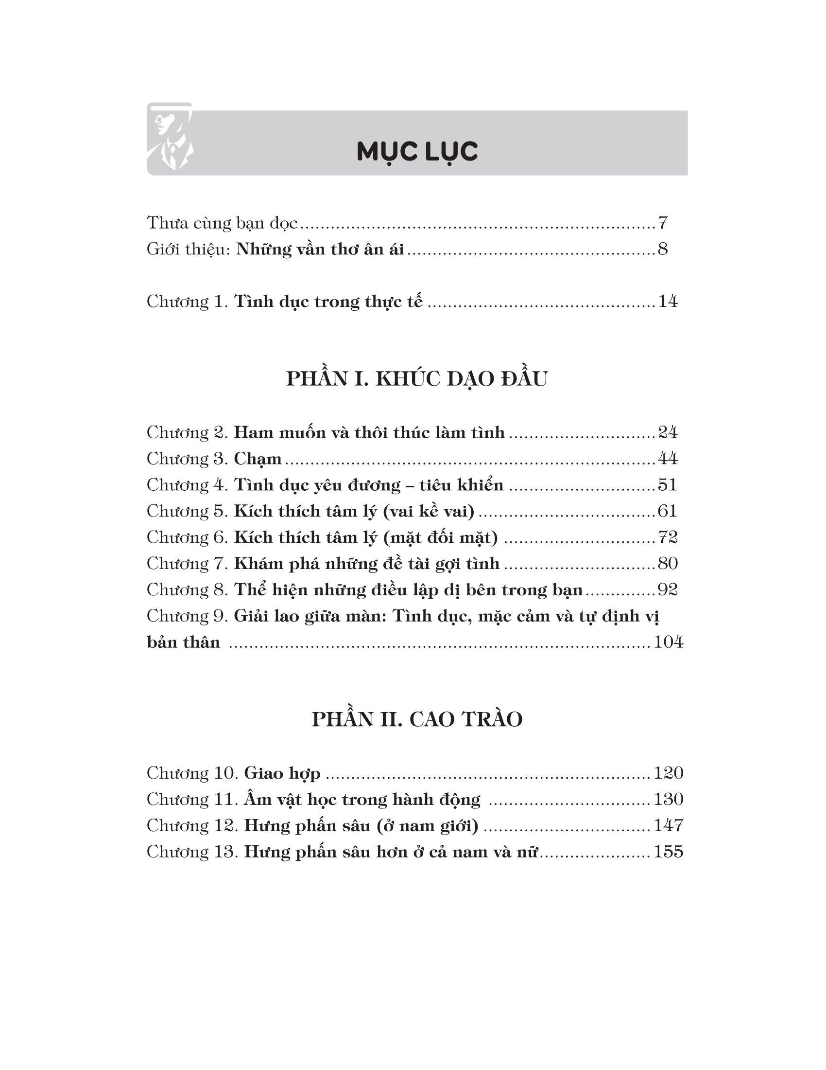 Trong xuyên suốt cuốn sách này, bạn có thể khám phá tận hang cùng ngõ hẻm của vùng đất “mây mưa”, những đề tài gợi tình và những “bí kíp” tạo hưng phẩn chỉ bằng những điểm chạm. Bài tập thực hành tại nhà dưới dạng bài tự suy ngẫm, kích thích tâm sinh lý và rèn luyện hành vi sẽ giúp bạn nâng cao được phần năng khiếu; Thế nhưng còn phần đam mê, thực hành – Đó lại là tuỳ vào bạn!
