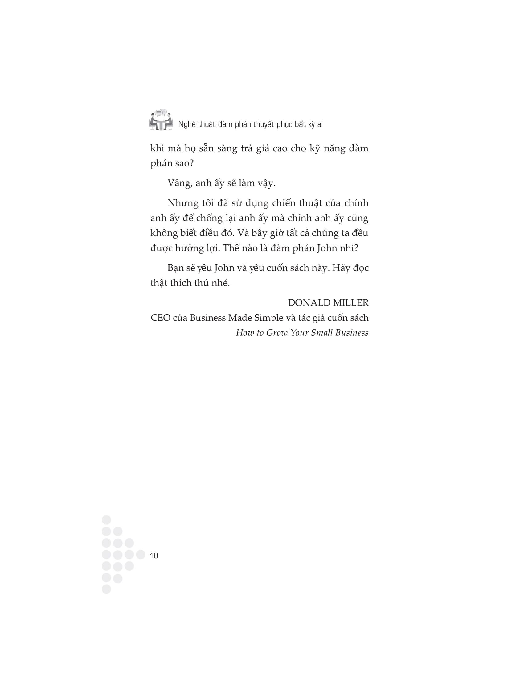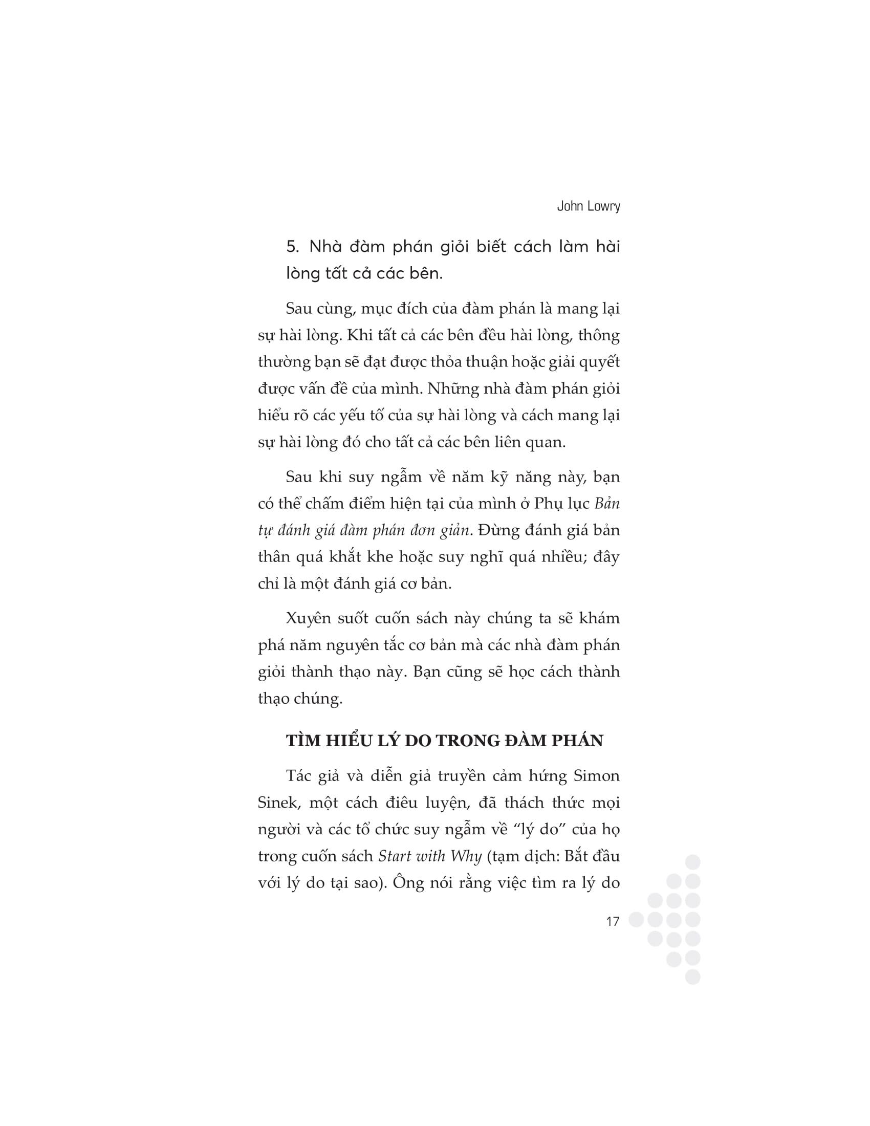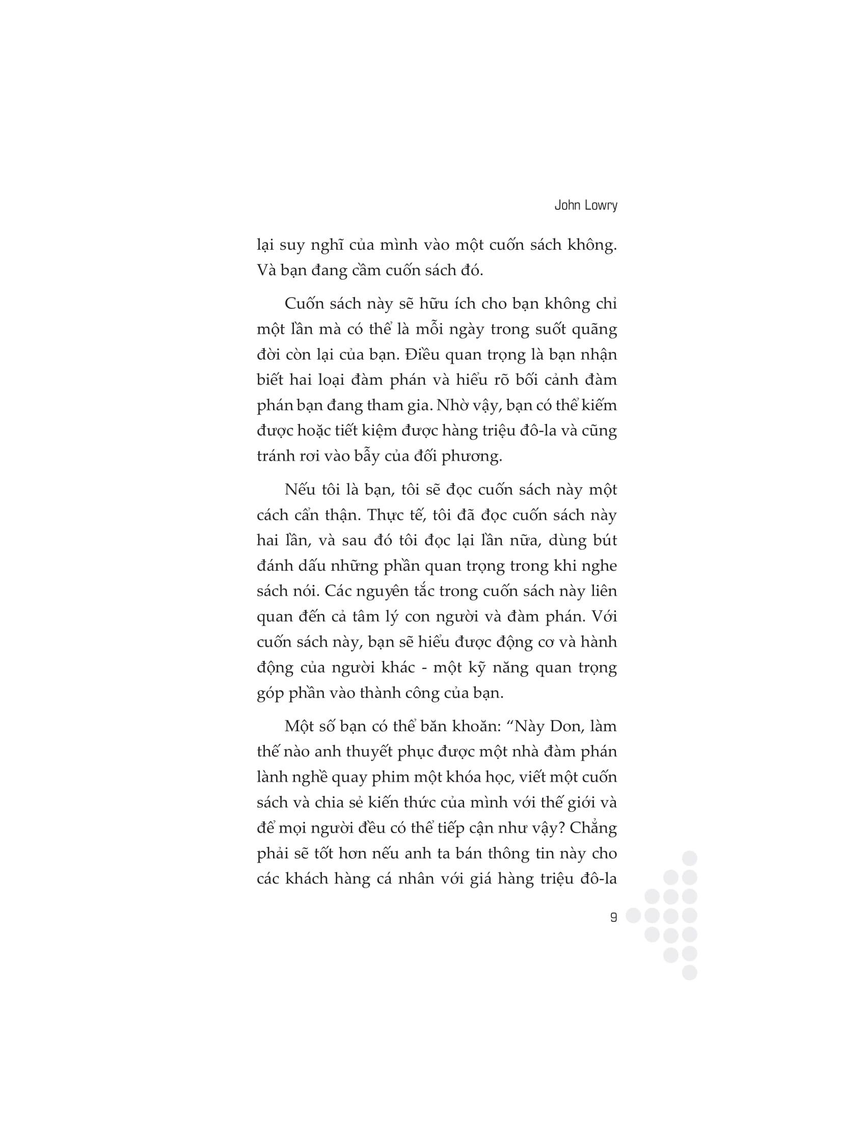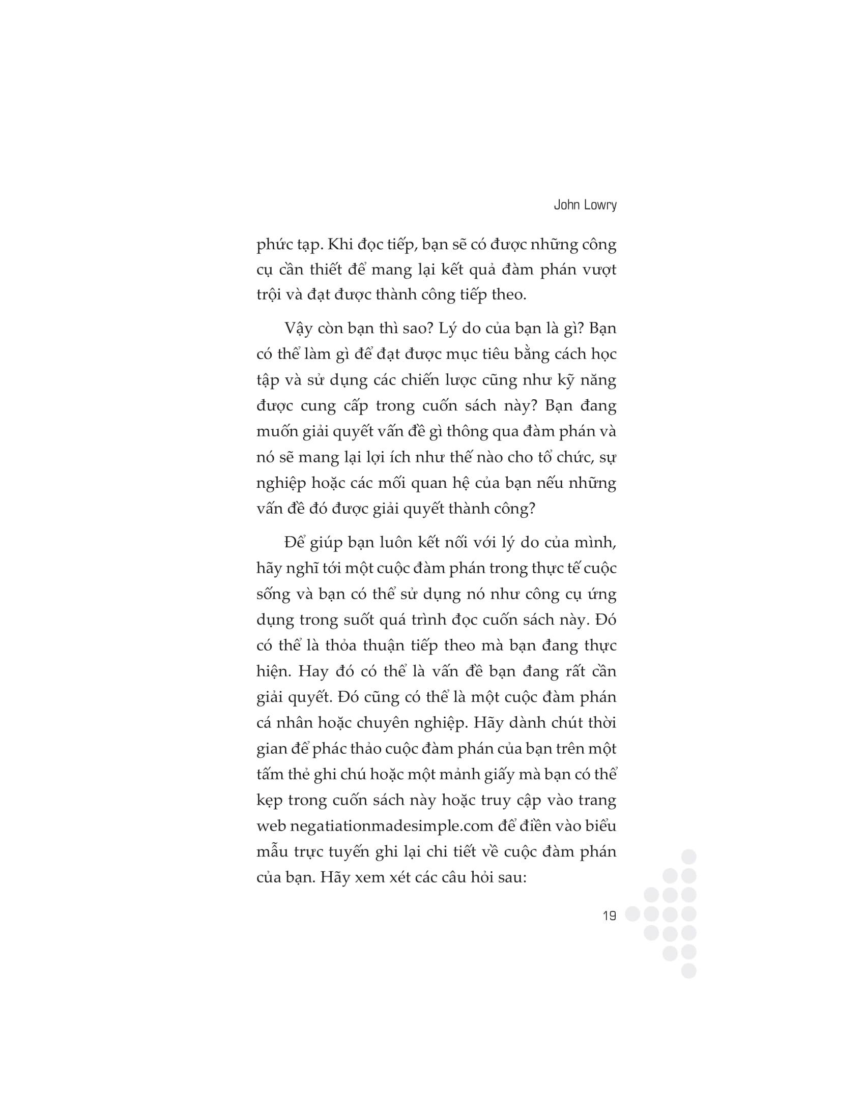 Cuốn sách này cung cấp một cách tiếp cận hữu ích và toàn diện để làm chủ cuộc đàm phán. Thông qua những lời khuyên hữu ích và hướng dẫn thực tế, tác giả John Lowry sẽ chỉ cho bạn cách gia nhập hàng ngũ những nhà lãnh đạo đã đạt được thành công chưa từng có bằng cách khiến việc thương thuyết trở nên đơn giản. Sự cần thiết của đàm phán được thể hiện trong mọi khía cạnh của đời sống, từ công việc đến cuộc sống đời thường. Phát triển kỹ năng đàm phán thuyết phục sẽ giúp bạn có thêm đạt được nhiều thành công, duy trì những mối quan hệ tốt đẹp và nâng cao hiệu quả khi giao tiếp.