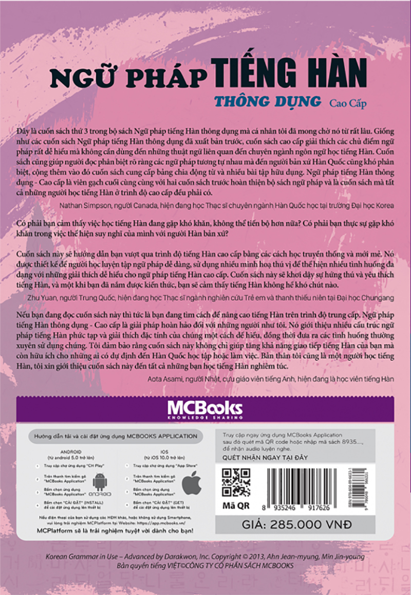 Nằm trong bộ sách Ngữ pháp tiếng Hàn nằm trong top sách được yêu thích nhất năm 2017, cuốn sách Ngữ pháp tiếng Hàn thông dụng Cao cấp là cuốn sách thứ 3 của bộ sách này, bổ sung những kiến thức ở cấp độ cao hơn cho người đọc.
