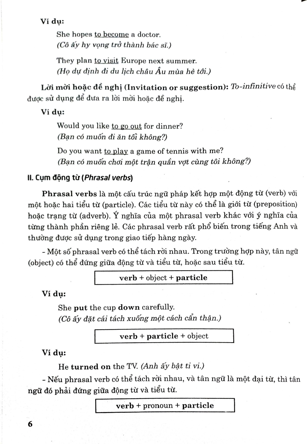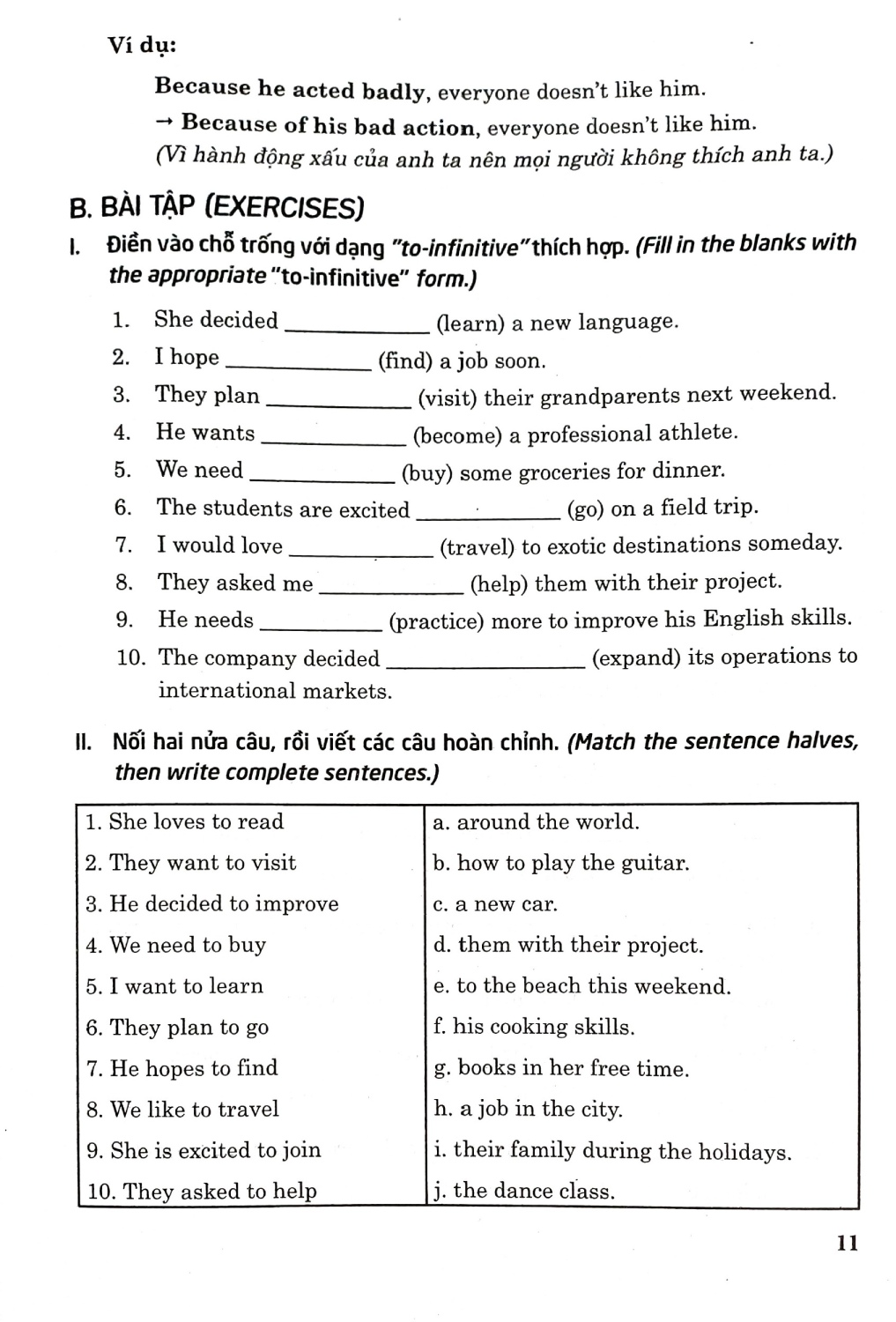 Sách bao gồm nhiều chủ điểm ngữ pháp và bài tập thực hành để các em học tập, rèn luyện và trau dồi kiến thức ngữ pháp tiếng Anh. Các chủ điểm ngữ pháp bám sát nội dung trong sách giáo khoa, ngoài ra còn được mở rộng thêm để các em nắm vững hơn về cách dùng động từ nguyên mẫu có to (to-infinitive); Cụm động từ (Phrasal verb); Mệnh đề trạng ngữ/cụm trạng ngữ chỉ lý do (Adverbial clauses/phrases of reason); Ôn tập về cách dùng “Would”; Cách dùng “Used to”; Mệnh đề quan hệ xác định (defining relative clause) với đại từ quan hệ.; Cách dùng “wish” với thì quá khứ đơn (past simple); Câu tường thuật (Reported speech); Cách dùng “could” và các từ hỏi (wh-words) trước to-infinitive; Cách dùng suggest + gerund (danh động từ); Mệnh đề trạng ngữ/cụm từ chỉ sự nhượng bộ; Cấu trúc so sánh hơn với các từ nhấn mạnh; Cách dùng cấu trúc động từ + danh động từ (verb + gerund); Cách dùng mệnh đề quan hệ không xác định; Thì quá khứ tiếp diễn (Past Continuous); Cách dùng các mệnh đề trạng ngữ chỉ kết quả (adverbial clauses of result); Câu điều kiện loại 1 với động từ khiếm khuyết (First Conditional with modal verbs); Cách dùng cấu trúc “Động từ + to infinitive”.