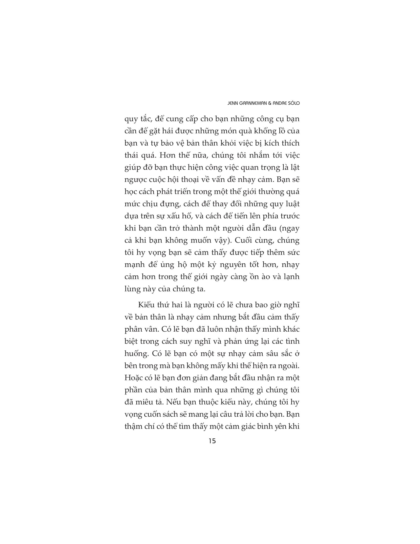 Người nhạy cảm đều có quyền lựa chọn con đường riêng của họ. Nhưng có một bước mà tất cả chúng ta đều phải thực hiện và nó là bước khó khăn nhất: ngưng nhìn nhận sự nhạy cảm là một khiếm khuyết và bắt đầu coi nó là một món quà. Cuốn sách chứa đầy cảm hứng này sẽ thay đổi mãi mãi cách chúng ta nhìn nhận những người nhạy cảm và cách họ nhìn nhận chính m.ình.