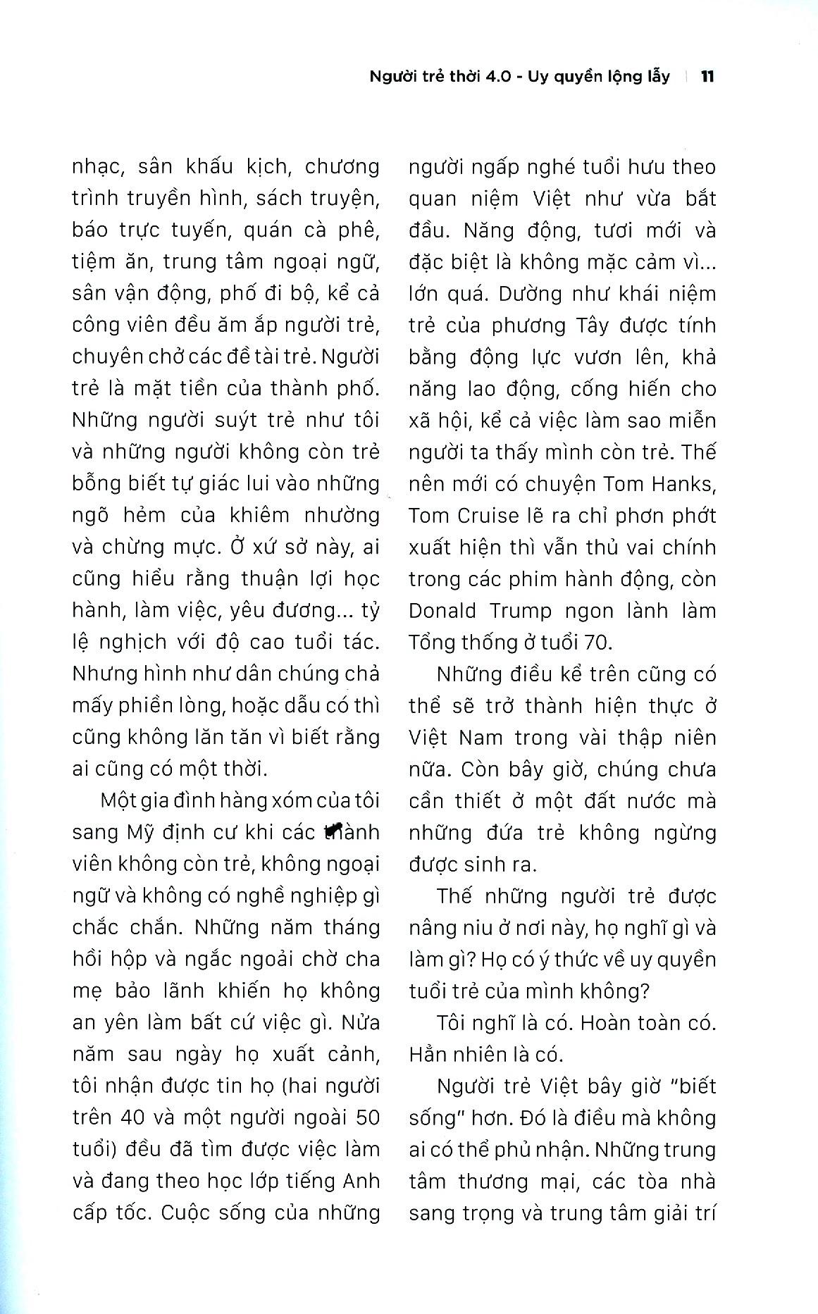 Nhiều tác giả Hồ Ngọc Đoan Khương, Trần Lê Hoa Tranh, Phương Dung, Diễm Trang, Thanh Vy, Hạnh Jiu, Kim Loan, Phương Thúy, Ngọc Huyền, Nguyễn Hồng Anh, Đoàn Khuyên, Hoàng Mai, Vũ Thị Thanh Tâm, Hạ Nguyên, Ngô Phương Từ. Người “suýt” trẻ nghĩ về người trẻ Mà người trẻ là ai vậy? Là những ai nhỏ hơn các đấng bậc trung niên và đã qua tuổi thanh thiếu niên. Là những ai đang tự hào đoan chắc mình là nhân vật chính trong mấy câu triết lý nhan nhản trên mạng kiểu “Tuổi thanh xuân giống như một cơn mưa rào, dù cho bạn từng bị cảm lạnh vì tắm mưa thì bạn vẫn muốn được đắm mình trong cơn mưa ấy lần nữa” hay “Không điên cuồng sao gọi là thanh xuân?”. Là những ai sáng vẫn ngủ nướng ngon lành nếu không phải đến lớp hoặc chỗ làm, trưa thèm bánh tráng trộn, trà sữa, tối thở dài vì thảm trạng FA (forever alone) và tối hôm sau lại khóc ướt gối vì thất tình hoặc vì được nhiều người vây bủa quá. Là những ai kè kè chiếc điện thoại dù thượng vàng hạ cám gì thì nhất định không được ngốc xít mà phải thông minh và vô Facebook được. Là những ai hừng hực khí thế xông pha vào tất thảy mọi sự trên đời. Và, là những ai nghĩ mình trẻ (như tôi chẳng hạn, ha ha!). Hay là thử phác thảo chân dung người trẻ thời 4.0 bằng một tập sách? Để chúng tôi hình dung, mô tả, nhận xét… về người trẻ Việt trong thời đại ăm ắp công nghệ và những biến động toàn cầu này liệu có khách quan không, có đầy đủ không? Chắc chắn là không. Nhưng tin rằng bức tranh người trẻ do chúng tôi họa nên có một dấu ấn riêng, trước hết vì nó được khởi nguồn từ chất liệu rất thật: tuổi trẻ của chính chúng tôi, say sưa kể câu chuyện của mình, lấy chính bản ngã của mình - từ chuyện ăn-đọc-họclàm-chơi đến chuyện ý thức, sức khỏe, đức tin, yêu đương, sai lầ - để đong đếm, đánh giá về người trẻ đương đại. Sài Gòn, 28/03/2019 Diễm Trang - Người trẻ cứ sai vì cuộc đời cho phép, cứ trả giá vì ngã rồi tự khắc lớn khôn thêm. - Nếu chúng ta quan niệm văn hóa dân gian như một không gian văn hóa truyền thống, phi chính thống, linh hoạt và tương thích với từng thời đại, thì sẽ không có gì là xộc xệch nếu chúng ta xếp mạng xã hội hay môi trường internet đương đại vào khung văn hóa dân gian cả - Đoạn tuyệt với lịch sử, với truyền thống sẽ tạo nên những công dân bơ vơ, mất ý thức về bản sắc - điều tạo nên căn cước của mỗi chúng ta trong thời đại hội nhập và toàn cầu hóa - Các độc giả hãy tận hưởng một kỷ nguyên thông tin đa sắc màu, hòa mình vào thế giới sống động ấy một cách khôn ngoan, không tự biến mình thành “con trâu” để bị xỏ mũi. - Đã xưa rồi cái thời muốn đi ăn, đi uống cà phê phải hỏi dò tìm quán, đi mua quần áo phải tới tận tiệm để thử đồ, đi chơi phải lên kế hoạch hàng mấy tháng trời hay có khi từ… năm trước. Bây giờ, chỉ cần một chiếc smartphone có kết nối mạng, bạn muốn gì cũng có và đi đâu cũng tới chỉ trong vòng một nốt nhạc. - Mỗi nơi các bạn đến, những trải nghiệm, những kiến thức và kinh nghiệm mà các bạn có được, thông qua mạng xã hội đã giúp cho mọi người gần nhau hơn, có thêm nhiều chọn lựa hơn cho những dự định và những mơ ước của chính mình. - Nylon và câu chuyện môi trường muôn thưở. Dẫu biết rằng muốn làm nên sự khác biệt có lúc cần phải quyết liệt và cực đoan, nhưng mình không phải là nhà hoạt động môi trường, mà chỉ lựa chọn điều chỉnh hành vi của bản thân sao cho thân thiện hơn với môi trường qua từng ngày. - Chúng ta có nhiều cách trưởng thành, du học là một trong những cách trưởng thành. Du học là chuyến đi lớn của cuộc đời, là cơ hội để các em trải nghiệm, vấp ngã, bước ra khỏi vùng an toàn và trưởng thành. - Trước đây, khi giáo dục còn mang tính ao làng, cái lớn nhất người du học đạt được là kiến thức. Nhưng bây giờ, cái quý nhất của một du học sinh là học được cách để làm mọi việc tốt nhất. Để mở cánh cửa này, người trẻ cần hai chìa khóa là ngoại ngữ và khả năng tự học tốt - Hãy tận dụng triệt để mọi cơ hội và phát huy nội lực của mình. Khi đó, ngoại cảnh lý tưởng sẽ mở ra trước mắt. Cơ hội dành cho tất cả, hãy chắc chắn là mình muốn và xách ba lô lên thôi! - Thực lòng, tôi thích phép thử và sai đó, hơn là bất kỳ sự lửng lơ nào. Dù sao thì khi ta sai, ta sẽ biết cách đối xử với tương lai bằng điều đúng đắn hơn. Đau khổ ư? Thì có gì đáng sợ? Ta chẳng phải đang có tuổi trẻ để chống đỡ lại rồi đó sao? - Tính dục là chuyện tự nhiên của con người từ khi đến tuổi dậy thì. Tôi đã đọc ở đâu đó sự xếp hạng các hành vi tính dục. Các nhà khoa học nói nhu cầu về tình dục trong con người cũng tự nhiên và cần thiết giống như các nhu cầu ăn, uống, ngủ nghỉ… Bởi vì nó tự nhiên, nó cần được diễ