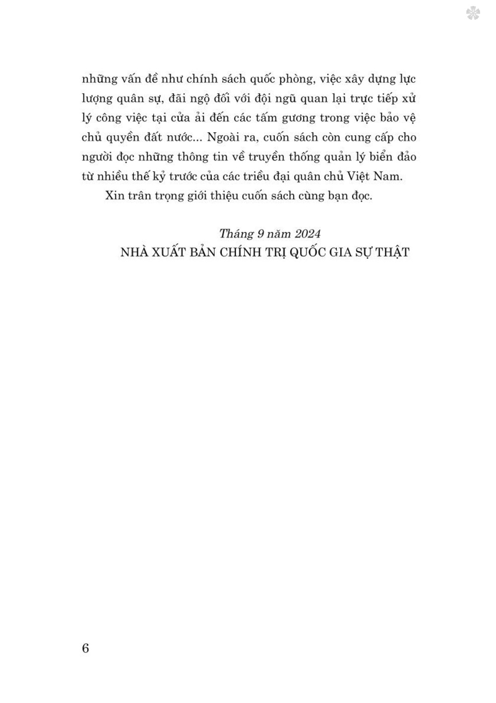 . Ngoài ra, cuốn sách còn cung cấp cho người đọc những thông tin về truyền thống quản lý biển đảo từ nhiều thế kỷ trước của các triều đại quân chủ Việt Nam. Xin trân trọng giới thiệu cuốn sách cùng bạn đọc.