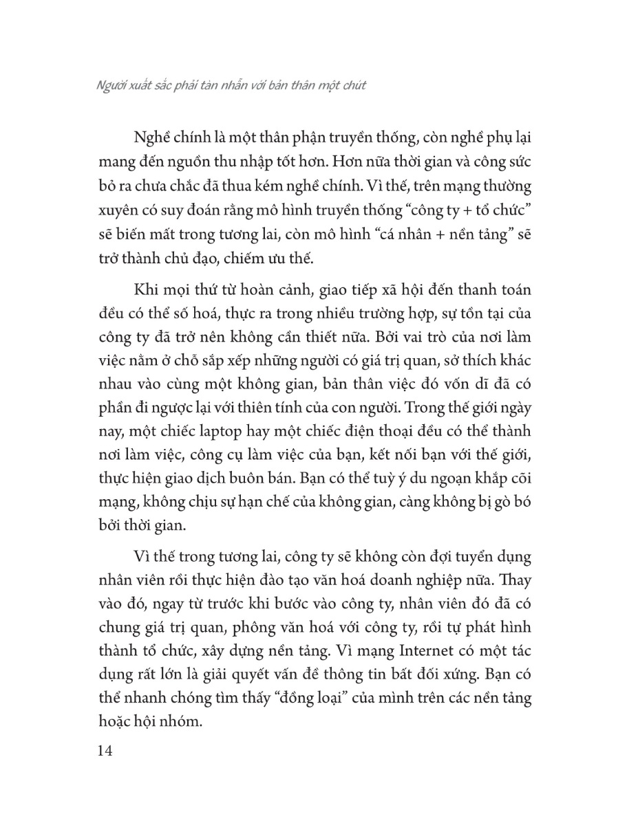 Người Xuất Sắc Phải Tàn Nhẫn Với Bản Thân Một Chút "So với tương lai đầy những điều không thể đoán trước, tương lai mà nhắm mắt cũng đoán ra được lại khiến tôi sợ hãi hơn." Một cuốn sách giúp bạn sử dụng thời gian tối ưu để làm điều mình muốn. Đây chắc chắn là một thời đại tốt đẹp, chúng ta có thể không cần thỏa hiệp, bắt đầu không chấp nhận việc dùng chi phí thời gian đắt đỏ để chứng minh một kết quả gượng ép. Nhưng đây dường như cũng là một thời đại tồi tệ, vì sức kiên nhẫn với thời gian dường như ngày càng yếu đi, chúng ta không thể nào ngồi yên để chờ thời gian mài giũa. Muốn "trùng tu" chính nội tâm của mình thì cần phải đánh đổi thứ quý giá nhất đối với bản thân, và đó không gì khác ngoài thời gian. Mọi trải nghiệm cảm động và vĩ đại đều ẩn chứa những tinh hoa của thời gian. . Một cuốn sách thôi thúc bạn bước ra khỏi vùng an toàn "ổn định" để trải nghiệm cuộc đời. Hành trình của tác giả Trần Lập Phi là hành trình "chuyển đổi đường đua của cuộc đời". Khi đọc cuốn sách này, bạn sẽ phải tự đặt ra câu hỏi rằng liệu tương lai "ổn định", êm ả không chút bất ngờ có phải tương mà bản thân mong muốn hay không. Bạn sẽ phải làm việc với bản thân, giữa một bên truyền thống là theo đuổi sự yên ổn, thế giới ngoài kia hiểm ác và đầy những điều bất trắc; còn nửa còn lại thì thúc giục bạn trải nghiệm và khám phá nhiều hơn, đừng quá "ổn định" mà kìm hãm chính bản thân mình. Bởi cái bạn coi là "ổn định" cũng chưa chắc là ổn định. "Tôi coi bản thân như một người ngắm nhìn thế giới. Nhiều lúc, vì chưa từng nhìn thấy thế giới bên ngoài, chúng ta mới tưởng rằng phạm vi thế giới mà mình nhìn thấy được chỉ có vậy." Một cuốn sách nhắn nhủ tới bạn, hãy tận dụng triệt để thời gian để khám phá những điều mới. Cuốn sách sẽ cung cấp cho độc giả một góc độ khác để nhìn thế giới. Đời người ngắn ngủi, đừng vì sợ hãi mà bó hẹp cuộc sống bạn chỉ bằng hai từ "ổn định". Hãy đi đến nhiều nơi, gặp gỡ nhiều người, tiếp xúc với nhiều lĩnh vực, học hỏi nhiều kiến thức mới mẻ và ngày ngày tích lũy những điều bổ ích. Để khi nhìn lại, bạn sẽ tự hào khi thấy bản thân mình phát triển và trở nên tốt hơn mỗi ngày.