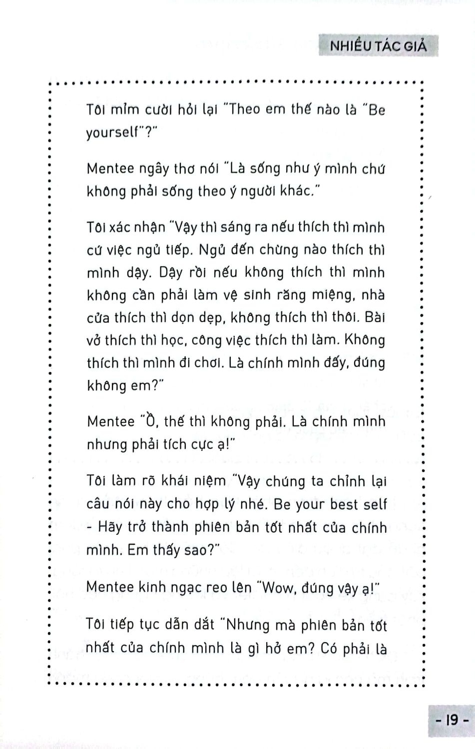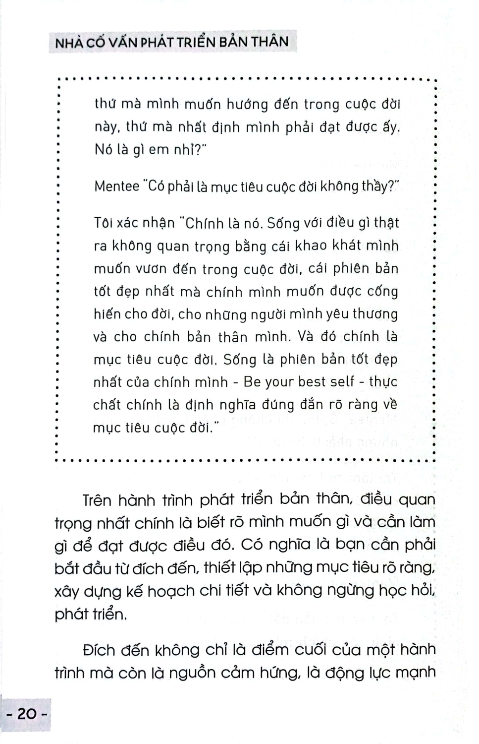 Nhà Cố Vấn Phát Triển Bản Thân (SB) Tiếp nối thành công của cuốn sách đầu tiên “NHÀ CỐ VẤN KHỞI NGHIỆP - Bí quyết trở thành nhà khởi nghiệp thành công và hạnh phúc”, Hội đồng Tư vấn và Hỗ trợ Khởi nghiệp phía Nam đã kết hợp cùng Công ty Cổ phần SBOOKS và Nhà xuất bản Văn Học, ra mắt quyển thứ 2 trong bộ sách “NHÀ CỐ VẤN”, với tên gọi “NHÀ CỐ VẤN PHÁT TRIỂN BẢN THÂN - 21 vấn đề và giải pháp giúp bạn trở thành phiên bản tốt nhất của chính mình”. Tại sao phải phát triển bản thân? Trong kỷ nguyên vươn mình của dân tộc, cơn sóng số hóa đã kéo theo một loạt những biến động của đời sống xã hội. Con người bị đặt vào thách thức mới: Làm thế nào để theo kịp vòng xoay nhanh chóng ấy? Làm thế nào để trở thành nhân sự ưu thế trong cuộc chiến tuyển dụng? Làm thế nào để sống cân bằng? Làm thế nào để trở thành con người ưu tú?... Vô vàn những câu hỏi được đưa ra, và nguồn chung của tất cả chúng là phải giải quyết được bài toán “thế hệ trẻ - thế hệ thanh niên cần gì và thiếu gì”. Đó chính là tất cả những nguyên nhân buộc phải đi đến kết quả “Phát triển bản thân”. Cuốn sách giúp gì trong hành trình này? Nếu như cuốn “NHÀ CỐ VẤN KHỞI NGHIỆP - Bí quyết trở thành nhà khởi nghiệp thành công và hạnh phúc” đưa ra những gợi ý, những giải pháp và cách thức để khởi nghiệp từ tâm thành công và hạnh phúc, thì phần tiếp nối là “NHÀ CỐ VẤN PHÁT TRIỂN BẢN THÂN - 21 vấn đề và giải pháp giúp bạn trở thành phiên bản tốt nhất của chính mình” sẽ tập trung vào 21 vấn đề và giải pháp giúp bạn định vị và hoàn thiện bản thân trong kỷ nguyên vươn mình này. Như bạn đã thấy ở đa số những cuốn sách kỹ năng, đó là người ta nói quá nhiều về lý thuyết mà không đưa ra thực hành, hoặc phổ biến hơn là cách dẫn dắt vấn đề ở dạng lý luận suông. “Nhà cố vấn phát triển bản thân” thì hoàn toàn khác biệt, vì nó như một bộ sưu tập các cuộc trò chuyện với các Mentor đa phong thái, đa lĩnh vực. Mỗi chương trong sách được viết theo cấu trúc quen thuộc của bộ sách “Nhà cố vấn”: đặt vấn đề - câu chuyện minh họa từ cuộc gặp gỡ thực tế giữa hai nhân vật mentor (người cố vấn) và mentee (người được cố vấn) - phân tích câu chuyện để đúc kết giải pháp. Điểm vô cùng đặc biệt là cuốn sách bám sát vào những tình huống thực tế của Mentor và Mentee, sau khi cung cấp giải pháp sẽ đưa ra những bài tập thực hành cho những cá nhân đang gặp vấn đề tương tự. Với 6 phần và 21 chương, cuốn sách này sẽ là người bạn đồng hành, giúp bạn khám phá và giải quyết những vấn đề cốt lõi trong việc xây dựng tầm nhìn, nhận thức và phát triển kỹ năng cần thiết để thành công. Từ việc trau dồi kiến thức đến việc hình thành thái độ tích cực và phong cách sống lành mạnh, mỗi chương đều được thiết kế để bạn có thể áp dụng vào cuộc sống thực tế và trở thành phiên bản tốt nhất của chính mình. Phần 1. Tầm nhìn định hướng tương lai: Giúp bạn xác định mục tiêu và phương hướng trong cuộc sống, đồng thời định vị bản thân và đưa ra lời tuyên ngôn thúc đẩy bản thân tiến xa hơn. Phần 2. Nhận thức xã hội - La bàn của sự phát triển: Nâng cao khả năng tự nhận thức bản thân cũng như nhận thức thế giới quan, nhân sinh quan xung quanh để bạn có những tư duy đúng đắn, quyết định cho thành công và hạnh phúc của bạn. Phần 3. Kiến thức - Nền tảng của thành công: Giúp bạn nhận diện những sai lầm thường mắc phải trong quá trình học hỏi, từ đó xác định phương pháp cập nhật kiến thức một cách hiệu quả. Phần 4. Kỹ năng - Công cụ kết nối thế giới: Phát triển các kỹ năng thiết yếu trong kỷ nguyên số và ứng dụng nó một cách linh hoạt trong công việc và cuộc sống. Phần 5. Thái độ quyết định con người bạn: Xác định thái độ sống và làm việc tích cực để hành trình cuộc sống trở nên thuận lợi và tốt đẹp hơn. Phần 6. Phong cách sống để có một cuộc đời hạnh phúc: Định hình lối sống lành mạnh và cân bằng. Phần kết - Kế hoạch hành động: Với những phần trên, bạn có thể đọc từ bất kỳ chương nào, có thể làm bất kỳ bài tập nào mà bạn cảm thấy hứng thú. Nhưng riêng phần kết này, bạn cần phải đọc xong 21 chương của sách thì mới đọc và thực hành được. Vì nó là phần hướng dẫn bạn lập bản kế hoạch phát triển bản thân chi tiết và linh hoạt sử dụng theo mục tiêu cá nhân của từng giai đoạn cuộc đời. Cuốn sách kỳ vọng trở thành nguồn cảm hứng cho những tâm hồn trẻ đang tìm kiếm lối đi riêng mình. Đặc biệt với các bạn trẻ vừa mới gia nhập thị trường lao động khắc nghiệt, những sinh viên đang đứng trước ngưỡng cửa cuộc đời, việc xác định phương hướng và phát triển bản thân là một nhiệm vụ đầy thách thức nhưng