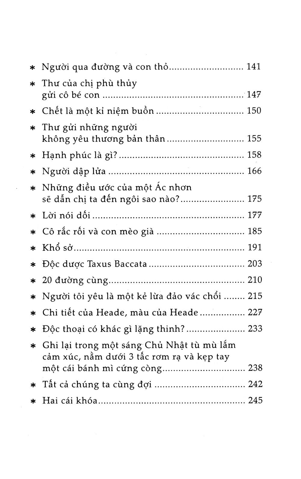 Lưu ý : Sách chỉ tặng quà cho bản in đầu tiên Trong hành trình trưởng thành của mình, chúng ta sẽ gặp gỡ được vô số người: Có người chiến đấu với thời gian, có người sợ thua kém bạn bè. Cũng có người mỗi ngày mở mắt, mỗi tối khép mi đều chỉ tồn tại cơm áo gạo tiền. Có người thấy bản thân hoảng loạn, cảm giác thua kém và tự ti khiến vô số ước mơ vì vậy mà chìm xuống vực thẳm. Hiện thực tàn nhẫn đến mức vùi lấp những ước mơ khi chúng chỉ vừa kịp nảy mầm. Có người một năm đi bệnh viện không biết bao nhiêu lần, tự mình bước vào khu vực cấp cứu. Trọn vẹn quá trình đều không rơi một giọt nước mắt. Nhưng hiển nhiên trong tim đầy gai góc, và nhiều vết sẹo đến đau lòng. Thế giới của người trưởng thành ngoài mặt bình lặng giản dị, nhưng trong lòng mỗi người đều là một trận chiến. “Đừng khóc trước khi đi ngủ” tựa một cái ôm gửi đến bạn - những người đang cảm thấy cuộc sống này không dễ dàng. Vết thương nào rồi cũng sẽ lành, nhưng nếu bạn bỏ cuộc ngay vào thời khắc ấy, người yêu thương cậu sẽ mang những vết thương mới. Sự có mặt của bạn vốn dĩ vẫn luôn có ý nghĩa với rất nhiều người. Mong bạn có thể đóng gói muộn phiền, chuyển giao vào hòm thư cũ, sống một đời rực rỡ. Mắt bạn đẹp như vậy, cười lên xinh biết bao. Bạn cười lên rất đẹp, nhớ cười nhiều một chút, nhất định phải vì chính mình mà vui vẻ sống. “Bất cứ khi nào bạn mệt mỏi, hãy tin rằng thế giới bao la, biển người rộng lớn, sẽ luôn tồn tại nơi chốn để bạn nương náu tâm hồn, yên ổn sống tốt phần đời sau này. Chúc bạn xuân sang, hạ qua dịu dàng, thu đến, đông tàn bình an”. Cảm ơn vì sau hàng ngàn lần bật khóc, bạn vẫn kiên cường bước tiếp.