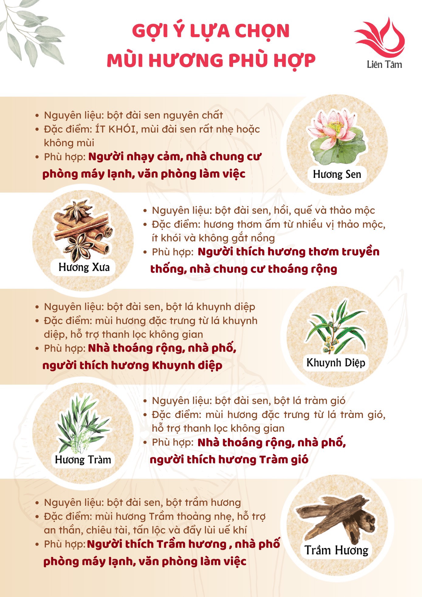 - Cam kết 100% thiên nhiên, thành phần: Bột đài sen, bột vỏ bời lời, bột hương tự nhiên, tăm tre, không hóa chất, không phẩm màu, không hương liệu, chân tâm màu mộc