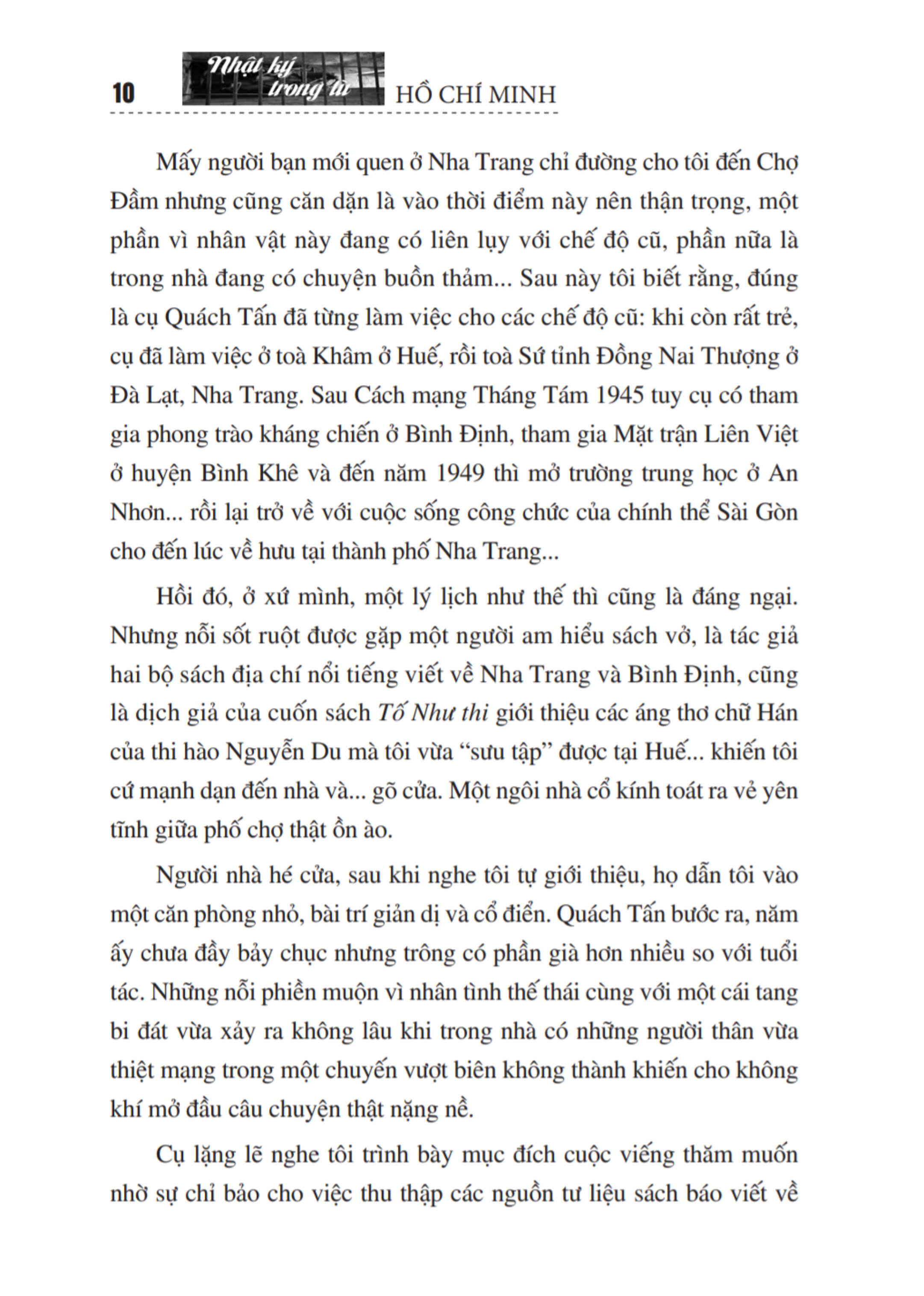 Với tấm lòng cảm phục Chủ tịch Hồ Chí Minh, nhà thơ Quách Tấn, một dịch giả thơ chữ Hán tài năng đã dành nhiều tâm huyết, công phu để dịch tập Nhật ký trong tù và nhờ một vị túc nho là nhà thư pháp Trần Thúc Lâm viết phần chữ Hán. Tập thơ được trình bày bằng lối thể hiện mới lạ, đặc biệt.