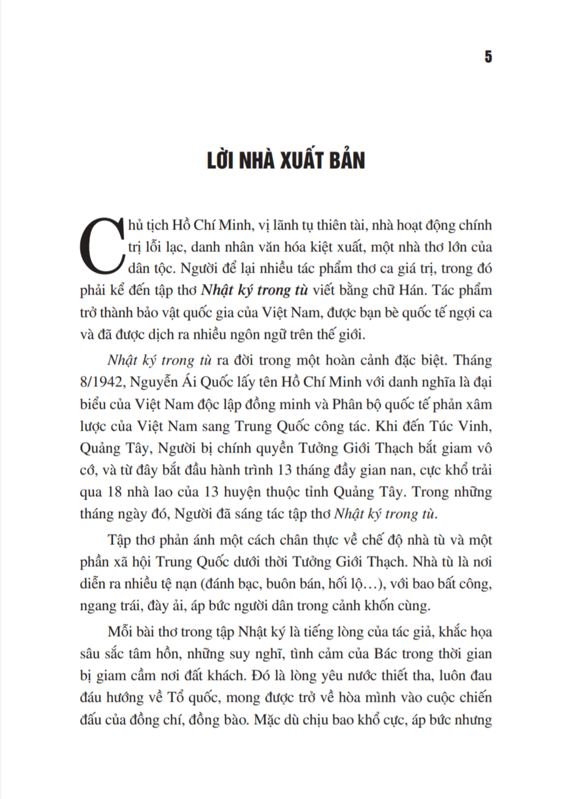 Chủ tịch Hồ Chí Minh, vị lãnh tụ thiên tài, nhà hoạt động chính trị lỗi lạc, danh nhân văn hóa kiệt xuất, một nhà thơ lớn của dân tộc. Người để lại nhiều tác phẩm thơ ca giá trị, trong đó phải kể đến tập thơ Nhật ký trong tù viết bằng chữ Hán. Tác phẩm trở thành b.ảo v.ật qu.ốc của Việt Nam, được bạn bè quốc tế ngợi ca và đã được dịch ra nhiều ngôn ngữ trên thế giới.