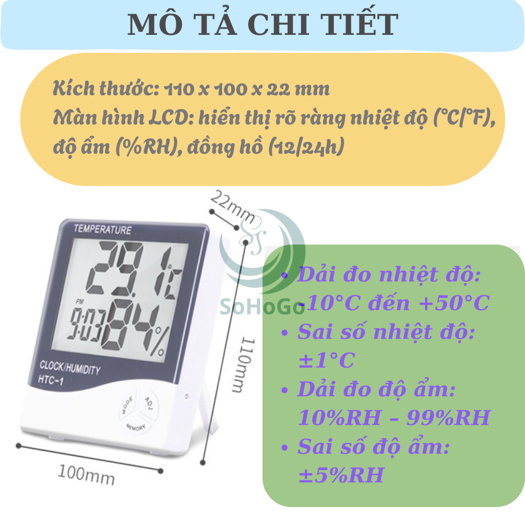 - Màn hình LCD: hiển thị rõ ràng nhiệt độ (°C/°F), độ ẩm (%RH), đồng hồ (12/24h)