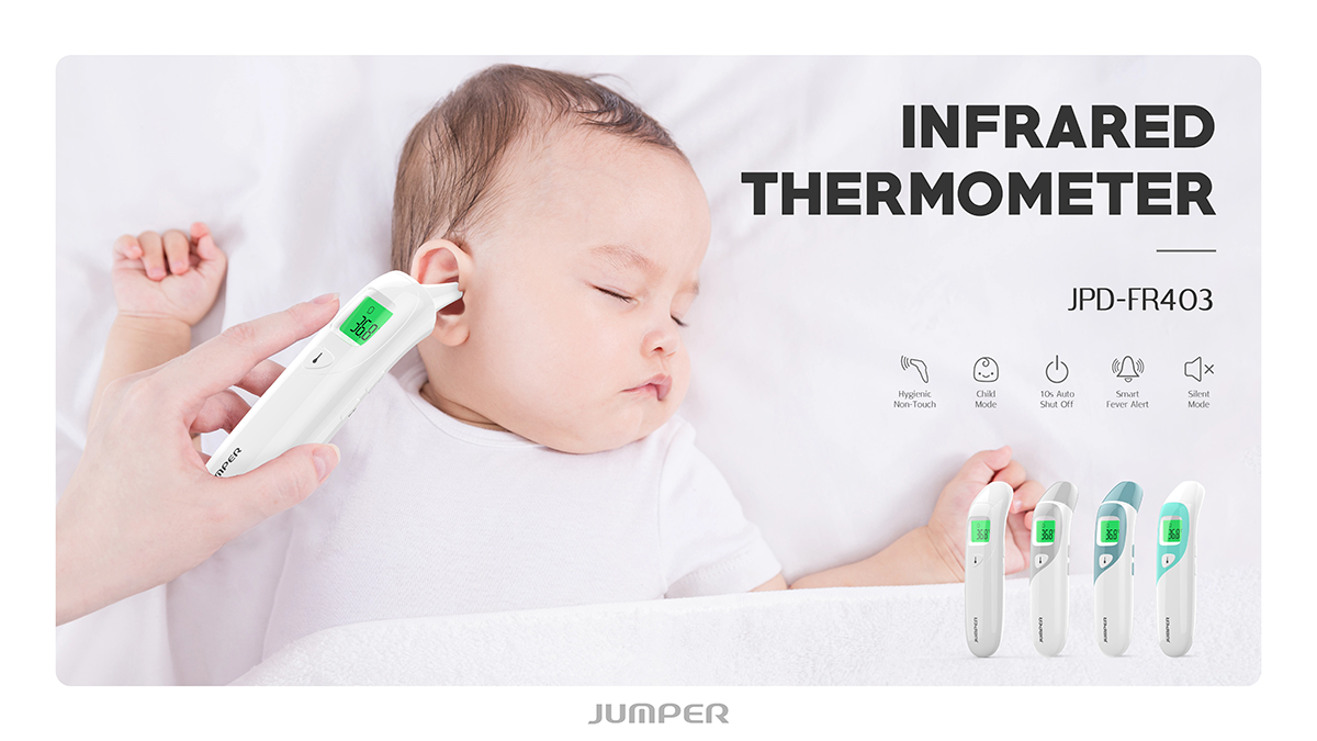 Nhiệt kế điện tử hồng ngoại đo trán và tai Jumper JPD-FR403 đạt chứng nhận an toàn từ FDA Hoa Kỳ. Sản phẩm được thương hiệu Jumper sản xuất theo tiêu chuẩn y tế. Sản phẩm nhiệt kế hiện đại cho phép đo nhiệt độ mà không cần tiếp xúc với trán hay bề mặt, giúp giảm thiểu tối đa sự lây nhiễm chéo các bệnh truyền nhiễm.