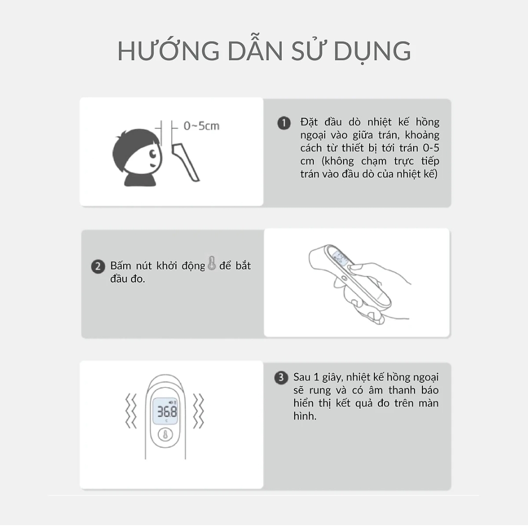 Nhiệt kế điện tử hồng ngoại không tiếp xúc *Công nghệ đo cảm biến tia hồng ngoại cho kết quả chính xác cao *Đo nhiệt độ cơ thể ở trán không tiếp xúc, trả kết
