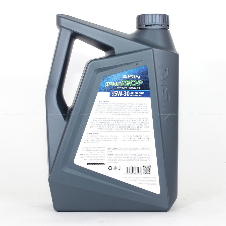 - Nhớt động cơ AISIN ESSN0354P 5W-30 SN PLUS greenTECH+ Semi Synthetic 4L là dầu nhớt bán tổng hợp chất lượng cao theo tiêu chuẩn API SN PLUS ECONTECH+, áp dụng công nghệ tiên tiến trong quá trình tổng hợp nhằm tăng hiệu suất. Dầu động cơ ô tô hiệu suất cao, ổn định, được chế tạo từ dầu gốc kỹ thuật Synthetic và hệ thống phụ gia tối ưu.
