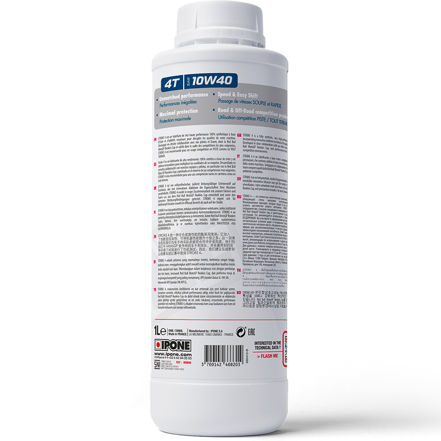 - IPONE STROKE 4 RACING OIL là Nhớt xe đua được thiết kế cho cả hai điều kiện hoạt động khác nhau trên đường trường (on-road) và đường địa hình (off-road). Sản phẩm hiện đang được sử dụng chính thức trong hai giải đua RedBull MotoGP Rookies Cup và MXGP Championship.