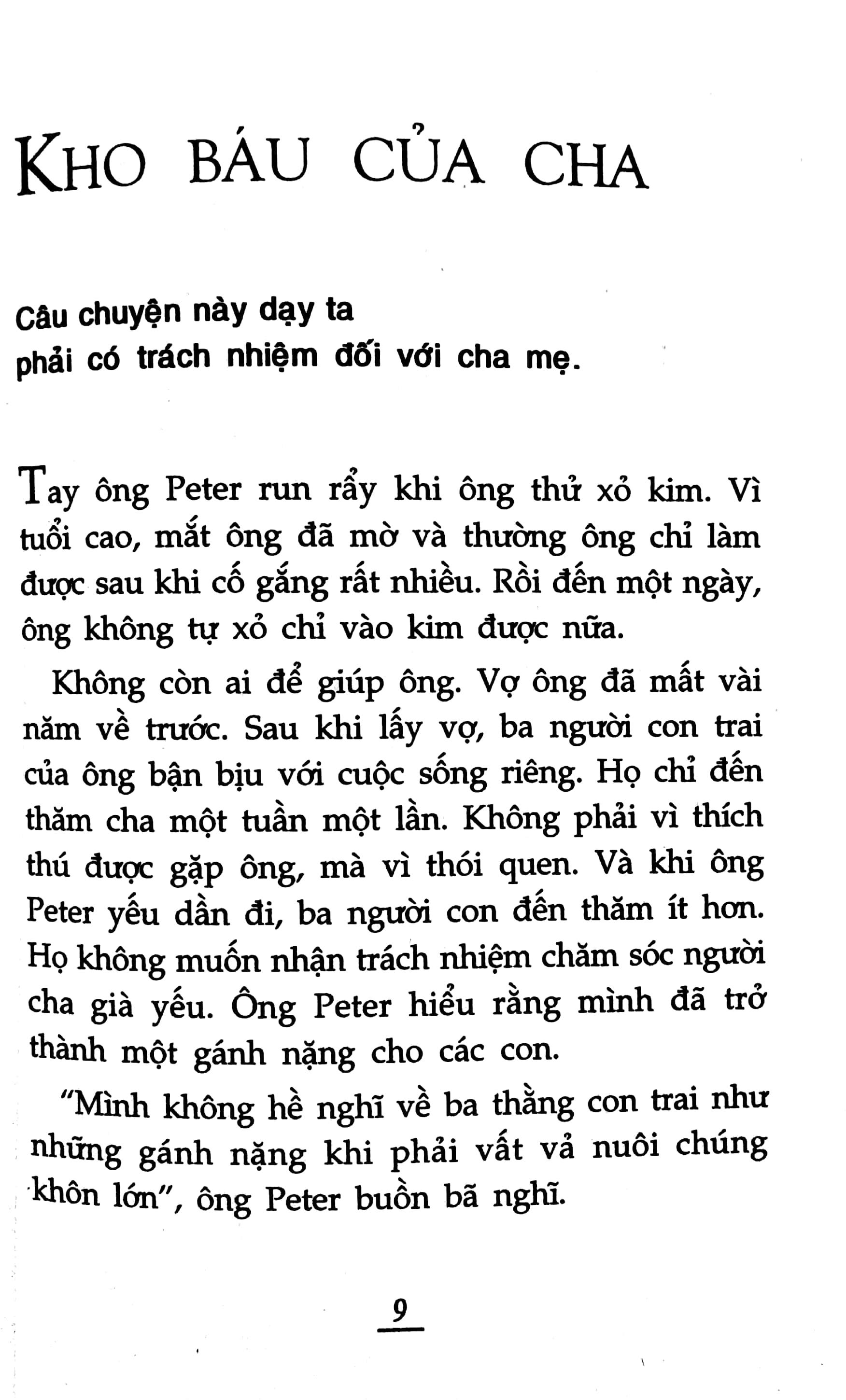 Việc các em được đọc ngay từ khi còn bé những câu chuyện đề cao những giá trị tốt đẹp là rất quan trọng. Và vì thế, NHỮNG CÂU CHUYỆN VỀ NHỮNG GIÁ TRỊ CAO ĐẸP ra đời. Bộ sách này được trình bày theo kiểu dễ đọc, có thể đọc ở nhà, trên lớp học…. Mỗi câu chuyện đều nhấn mạnh một đức tính nào đó như tính trung thực, tình nhân ái, lòng dũng cảm, tinh thần trách nhiệm… Những giá trị chân thật không bao giờ cũ, không bao giờ thừa. Sách gồm 12 câu chuyện về lòng thương người.