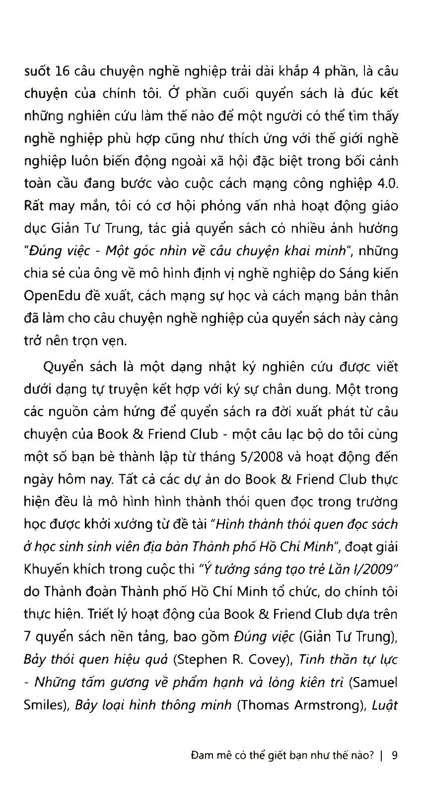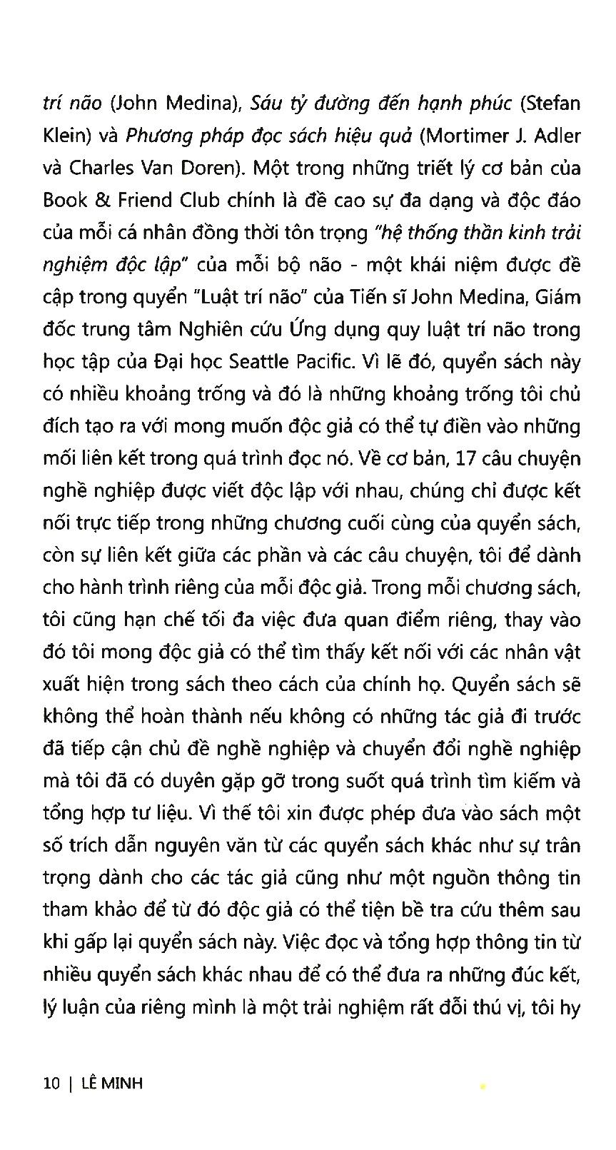 “Tôi cho rằng nếu được lựa chọn, ai cũng mong mình sẽ tìm được một nghề nghiệp tốt ở những năm đầu của tuổi 20. Nhưng nếu dành dành lúc nào cũng nở hoa thì cuộc sống làm gì có khái niệm “bế tắc”. Là một trong những người đã từng bị mắc kẹt trong giai đoạn chuyển đổi nghề nghiệp đầy khó khăn, hơn ai hết tôi mong người trẻ sẽ có những bước đi thuận lợi hơn trong hành trình tìm kiếm nghề nghiệp và đam mê của mình. Và nếu chuyển đổi công việc là một bước đệm để các bạn theo đuổi ước mơ lớn của đời mình thì tôi hy vọng những câu chuyện trong quyển sách này sẽ tiếp thêm động lực để bạn thực hiện cú nhảy ngoạn mục đó”.