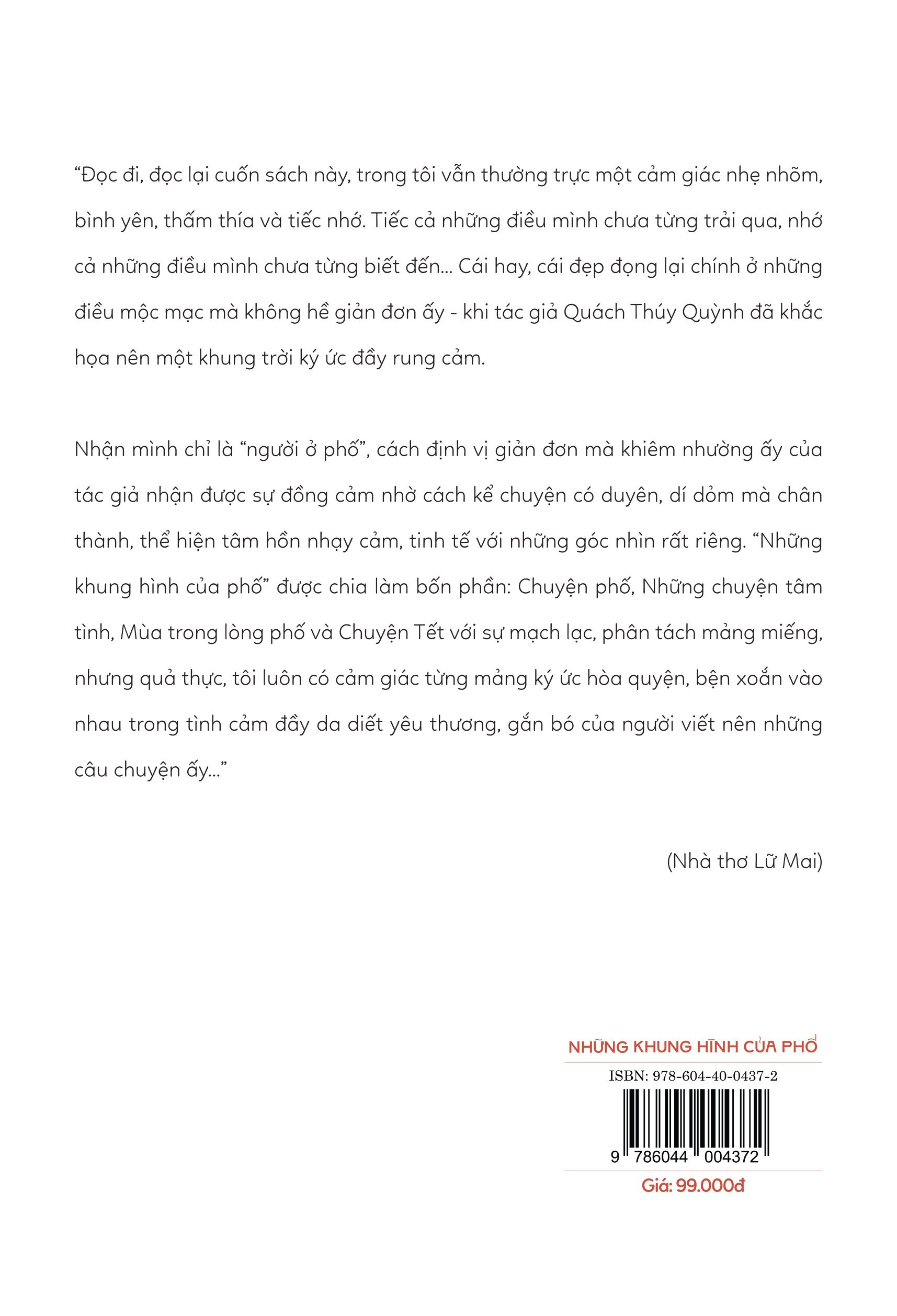 Cái hay, cái đẹp đọng lại chính ở những điều mộc mạc mà không hề giản đơn ấy - khi tác giả Quách Thúy Quỳnh đã khắc họa nên một khung trời ký ức đầy rung cảm. Nhận mình chỉ là “người ở phố”, cách định vị giản đơn mà khiêm nhường ấy của tác giả nhận được sự đồng cảm nhờ cách kể chuyện có duyên, dí dỏm mà chân thành, thể hiện tâm hồn nhạy cảm, tinh tế với những góc nhìn rất riêng. “Những khung hình của phố” được chia làm bốn phần: Chuyện phố, Những chuyện tâm tình, Mùa trong lòng phố và Chuyện Tết với sự mạch lạc, phân tách mảng miếng, nhưng quả thực, tôi luôn có cảm giác từng mảng ký ức hòa quyện, bện xoắn vào nhau trong tình cảm đầy da diết yêu thương, gắn bó của người viết nên những câu chuyện ấy.