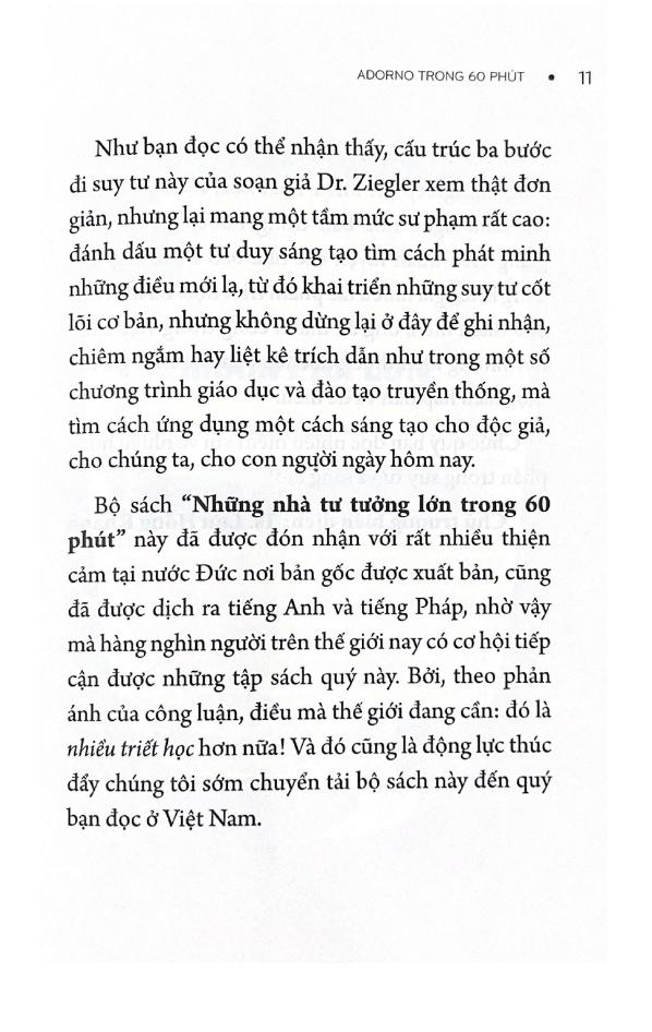 Adorno cho đến ngày hôm nay là một trong những nhà tư tưởng thông thái và thiên bẩm nhất trong lịch sử triết học. “Lý thuyết Phê phán” về xã hội của ông vừa cấp tiến vừa kích động. Theo Adorno, tất cả chúng ta đang sống trong một thế giới hoàn toàn bị chủ nghĩa tư bản thao túng. Thời đại Khai minh với hy vọng lớn về tiến bộ và giải phóng đã bị lộn ngược.