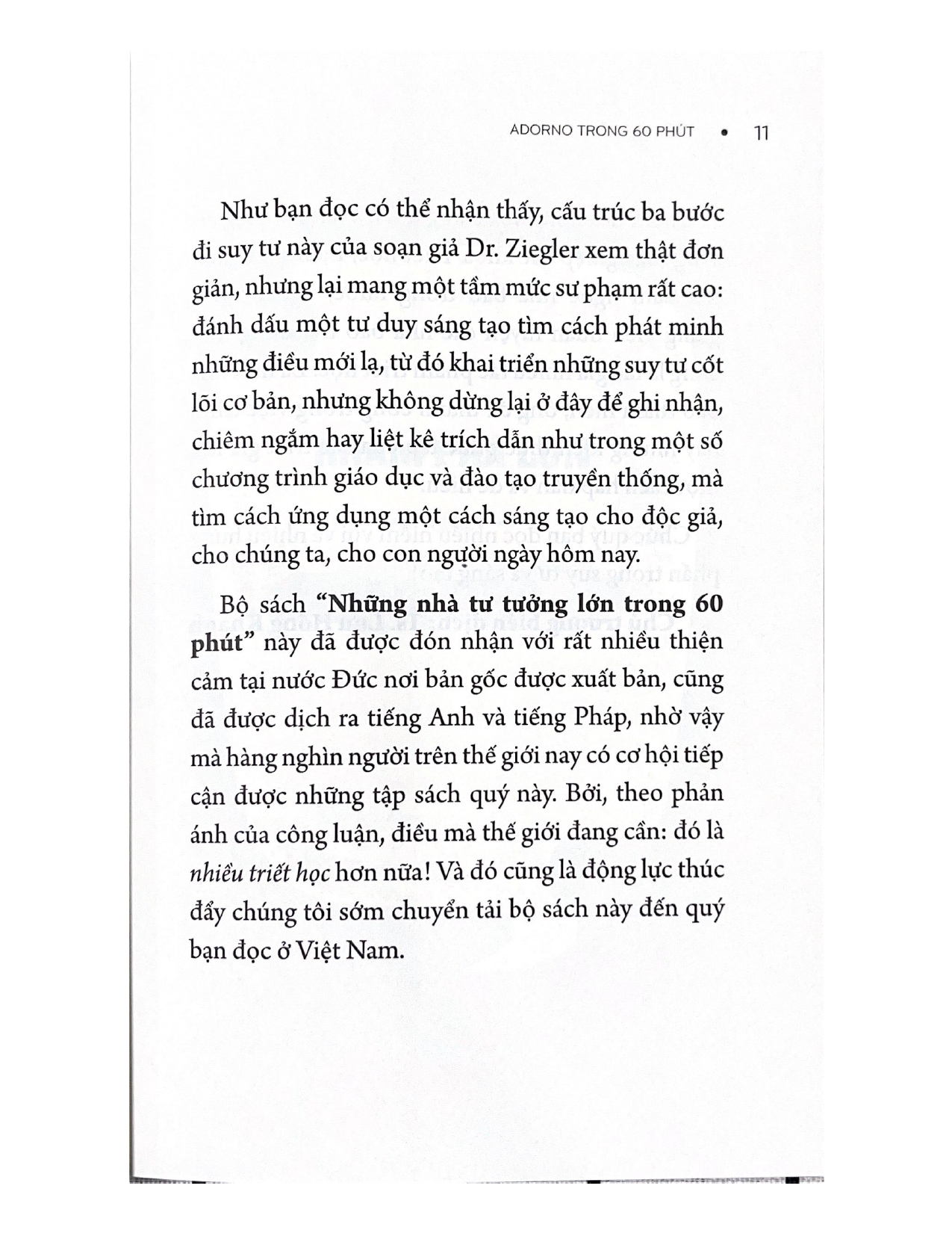 Adorno cho đến ngày hôm nay là một trong những nhà tư tưởng thông thái và thiên bẩm nhất trong lịch sử triết học. “Lý thuyết Phê phán” về xã hội của ông vừa cấp tiến vừa kích động. Theo Adorno, tất cả chúng ta đang sống trong một thế giới hoàn toàn bị chủ nghĩa tư bản thao túng. Thời đại Khai minh với hy vọng lớn về tiến bộ và giải phóng đã bị lộn ngược.