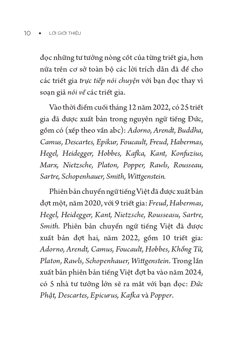 - Giới thiệu Những Nhà Tư Tưởng Lớn - Popper In 60 Minuten - Popper Trong 60 Phút Popper nêu ra lý tưởng về khoa học của “xã hội mở“: Mọi lý thuyết khoa học đều chỉ có giá trị hiệu lực cho đến khi nó bị phản bác bởi một ví dụ phản chứng hoặc bị thay thế bởi một lý thuyết chính xác hơn. Xã hội phải luôn luôn cởi mở đối với việc phê phán và đổi mới nhận thức của chúng ta Phương pháp thử và sai in dấu ấn lên sự tiến hóa. Từ muôn thuở, thực vật và động vật tối ưu hóa cơ may sống còn bằng những đột biến thất bại và thành công: Khoảng cách từ trùng a-míp đến Einstein chỉ là một bước. Triết học cho mọi người! Bộ sách Những nhà tư tưởng lớn lần đầu tiên trình bày sâu sắc công trình của các nhà triết học quan trọng nhất: Dễ hiểu, thú vị và rất thời sự.” – Martin Politowski “Tất cả đều được trình bày hết sức rành mạch: Phê phán của Popper đối với mọi chủ nghĩa toàn trị, yêu sách về xã hội mở, sự khích lệ những bước đi táo bạo trong khoa học và chính trị. Một gợi ý quan trọng trong thế giới đang tự mãn với chủ nghĩa tiêu thụ và lúng túng trong chính trị.”