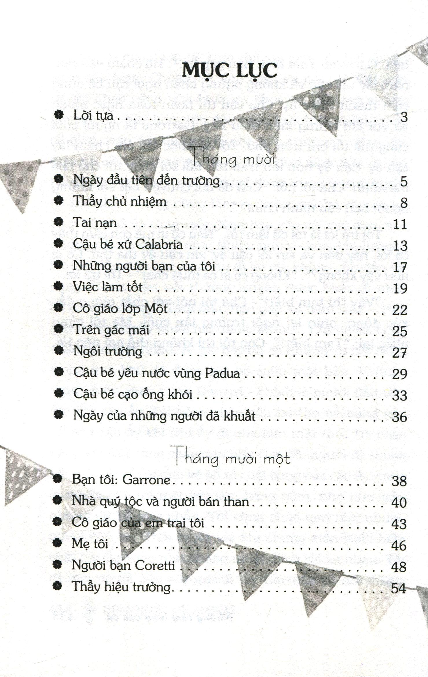 Xen kẽ vào cuốn nhật kí của cậu bé Enrico là các truyện đọc hàng tháng (thầy giáo yêu cầu học sinh chép để đọc cho cả lớp), đây là những câu chuyện kể về tấm gương những thiếu niên dũng cảm của nước Ý, có những người hi sinh vì Tổ quốc như cậu bé trinh sát ở Lombardia, có người chết để cứu những người thân thiết như cậu bé ở Roma hay cậu bé người Sicilia, và cả những người có nhiều nghĩa cử cao đẹ