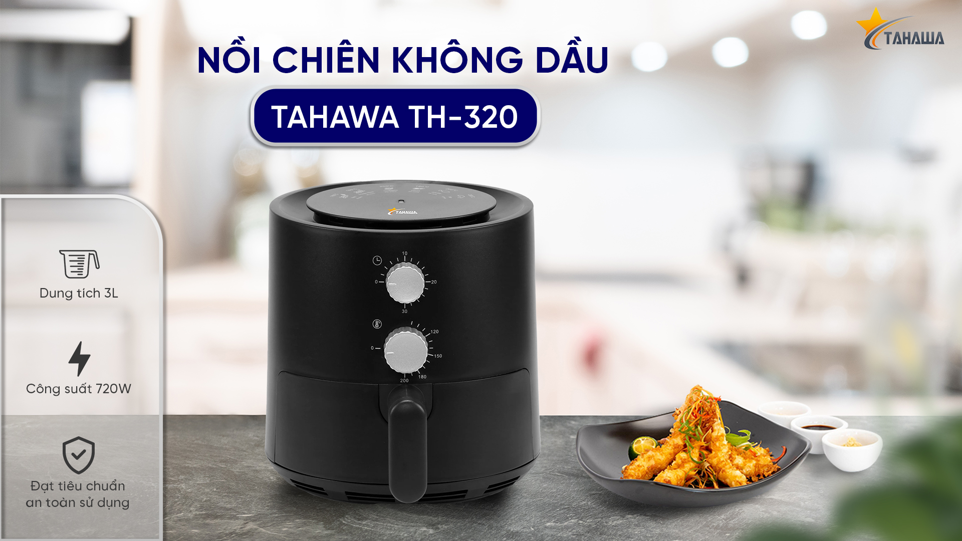 Nồi chiên không dầu hàng nhập khẩu chính hãng Tahawa TH-320 - Nồi chiên không dầu giúp giảm lượng dầu mỡ trong bữa ăn, cải thiện sức khỏe gia đình. Thông số kỹ thuật Nồi chiên không dầu Tahawa TH-320 có màu đen nhám đẹp mắt, thiết kế dung tích sử dụng 3 lít, công suất 720W, công nghệ hiện đại giúp làm chín thực phẩm. Ứng dụng công nghệ chiên không dầu mới nhất giúp hạn chế dầu mỡ tối đa cho món chiên, nướng thơm ngon, bổ dưỡng và tốt với sức khỏe của người dùng hơn. Đặc biệt, thích hợp sử dụng sản phẩm nấu ăn cho người già và trẻ nhỏ. Núm vặn chỉnh nhiệt độ từ 90 - 200 độ C, trên mặt nồi có chỉ dẫn mức nhiệt độ và thời gian nướng phù hợp cho món cốt lết, khoai tây chiên, đùi gà, cá và bánh ngọt . TH-320 có công suất lên tới 720W, giúp thực phẩm chín nhanh hơn mà vẫn tiết kiệm điện năng. Tay cầm rổ chiên cứng cáp, chắc chắn, bọc nhựa cách điện an toàn cho người sử dụng. Lòng nồi chiên không dầu thép sơn tĩnh điện, phủ chống dính giảm tình trạng dính cháy, chống trầy, dễ làm sạch. Vỉ chiên được làm gọn đẹp, tách dầu mỡ nhanh, tháo rời khỏi rổ chiên dễ dàng, tiện vệ sinh và cất giữ Nồi chiên Tahawa TH-320 dung tích 3 lít có thiết kế sang trọng, tinh tế, chế biến món ăn ngon, bổ dưỡng, tiện dụng trong gia đình hiện đại. Lưu ý khi sử dụng nồi chiên không dầu Bảo hành chính hãng 18 tháng  1 đổi 1 trong 30 ngày