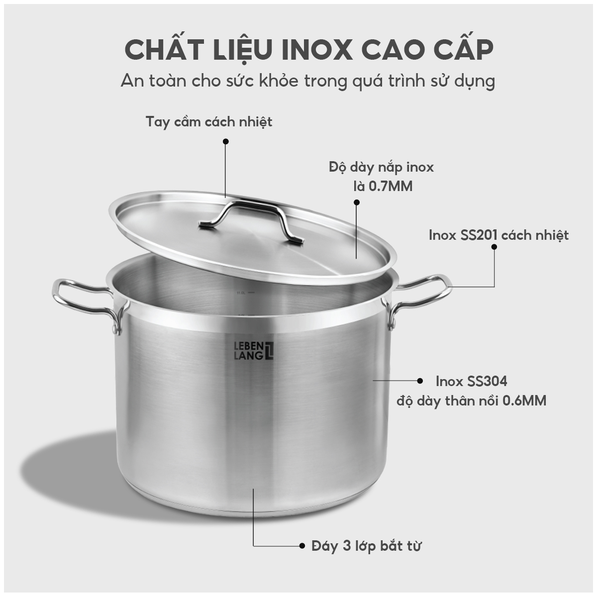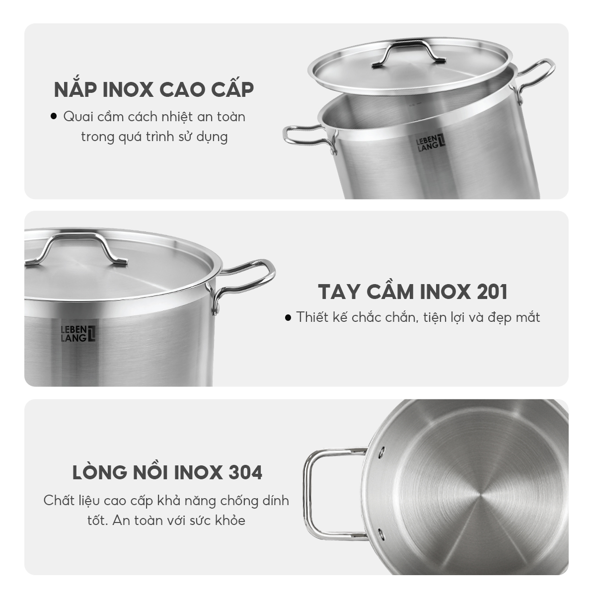 - Chất Liệu Cao Cấp: Nồi inox 304 Lebenlang với lòng nồi chống dính, bền bỉ và an toàn cho sức khỏe, giúp bạn nấu ăn hiệu quả và dễ dàng vệ sinh