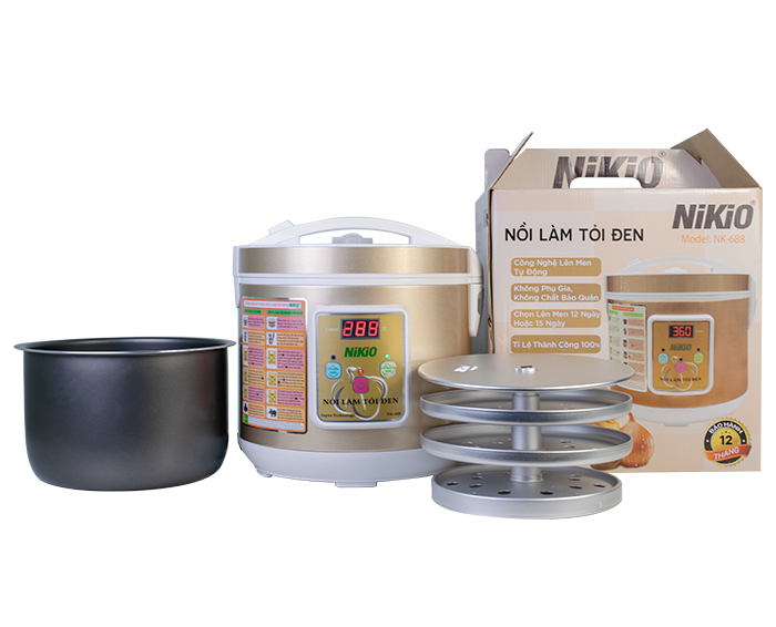 Nồi làm tỏi đen gia đình Nhật Bản Nikio NK-688 được sản xuất theo công nghệ hiện đại của Nhật Bản, thiết kế theo quy trình lên men tự động, làm tỏi đen nhanh chóng trong vòng 12 hoặc 15 ngày tùy vào chọn làm tỏi nhánh hay tỏi đơn, tiết kiệm thời gian và điện năng cho người dùng. Đồng thời mang lại hiệu quả cao, với tỷ lệ lên men thành công đạt tới 100% tỏi thành phẩm đạt yêu cầu. Sản phẩm được thiết kế với tháp 3 tầng làm được nhiều tỏi hơn khoản 1.5kg tỏi tươi, chất liệu xoong nồi cao cấp với công nghệ sơn tĩnh điện 2 lớp, mâm nhiệt 3 chiều giúp nhiệt lượng tỏa đều quanh nồi, tỏi đen được sấy đủ nhiệt vào những ngày cuối, giúp tỏi khô, chín đều, dẻo và thơm ngon giữ nguyên được dưỡng chất trong tỏi khi thành phẩm. Nồi làm tỏi đen Nikio là sản phẩm chất lượng được nhiều người tin dùng. Ưu điểm nổi bật Máy làm tỏi đen gia đình Nikio NK-688: