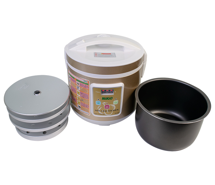 - Đây là món quà để chăm sóc sức khỏe đầy ý nghĩa dành cho người thân trong gia đình bạn. Thông số kỹ thuật máy làm tỏi đen 2 trong 1 Nikio: Model: NK-688 - Mẫu cải tiến mới Thuộc dòng: Máy làm tỏi đen gia đình Tính năng: Làm được đen 1 nhánh (tỏi cô đơn), và tỏi nhiều nhánh Có tính năng nhớ thời gian nếu có sự cố mất điện đột ngột. Sản xuất theo công nghệ lên men tỏi đen Nhật Bản Điện năng sử dụng: AC 220-240V, tần số 50/60HZ Công suất tiêu thụ: 90W. Thể tích bên trong: 5L Nhiệt độ lên men tối đa: 80 oC Nhiệt độ sấy: 81 oC tới 90 oC Màu sắc: Vàng Gold Trọng lượng nguyên thùng: 3,5kg Trọng lượng nồi: 3kg Kích thước thùng: 300x300x318mm (LxWxH) Kích thước nồi: 260x160 mm Kích thước xoong nồi: 240x140 mm Chất liệu mâm gia nhiệt: hợp kim gang Thời gian hoàn thành 1 lần lên men tỏi đen thành công là: 289 giờ (tương đương 12 ngày) đối với tỏi nhiều nhánh. Thời gian hoàn thành 1 lần lên men tỏi đen thành công là: 360 giờ (tương đương 15 ngày) đói với tỏi cô đơn (tỏi đơn). Khối lượng tỏi trắng lên men 1 lần: Tối đa 1,5kg, tùy vào kích thước và giống tỏi tươi. Khuyến cáo để tỏi đen ra đạt đúng chất lượng nên làm từ 1 tới 1,2 vừa. Khối lượng tỏi đen thành phẩm: 50-60% khối lượng nguyên liệu tỏi trắng đầu vào (tùy vào giống tỏi có năng suất khác nhau). Chế độ tự động kiểm soát nhiệt độ theo quy trình lên men tỏi đen tốt nhất và lên men hoàn toàn tự động 100%. Hệ thống vi mạch tự động lưu trữ thời gian khi mất điện và tiếp tục hoạt động trở lại khi có điện mà không ảnh hưởng tới chất lượng mẻ tỏi đen Tính năng tự động sấy khô khoảng vài ngày cuối của chu trình làm tỏi đen.